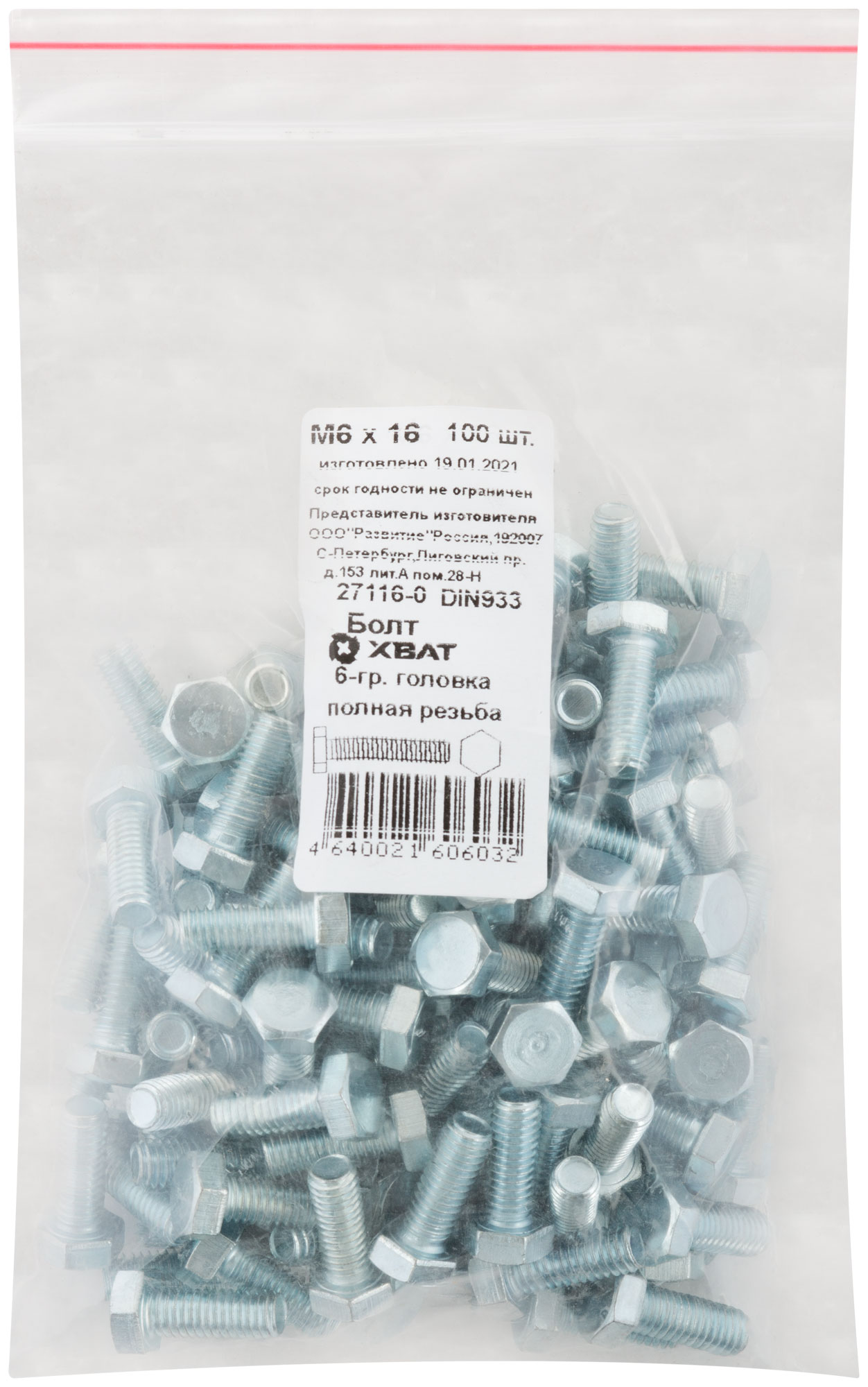 Болт 6-гранная головка (полная резьба) DIN933 М6 х 16 100 шт. Фасовка