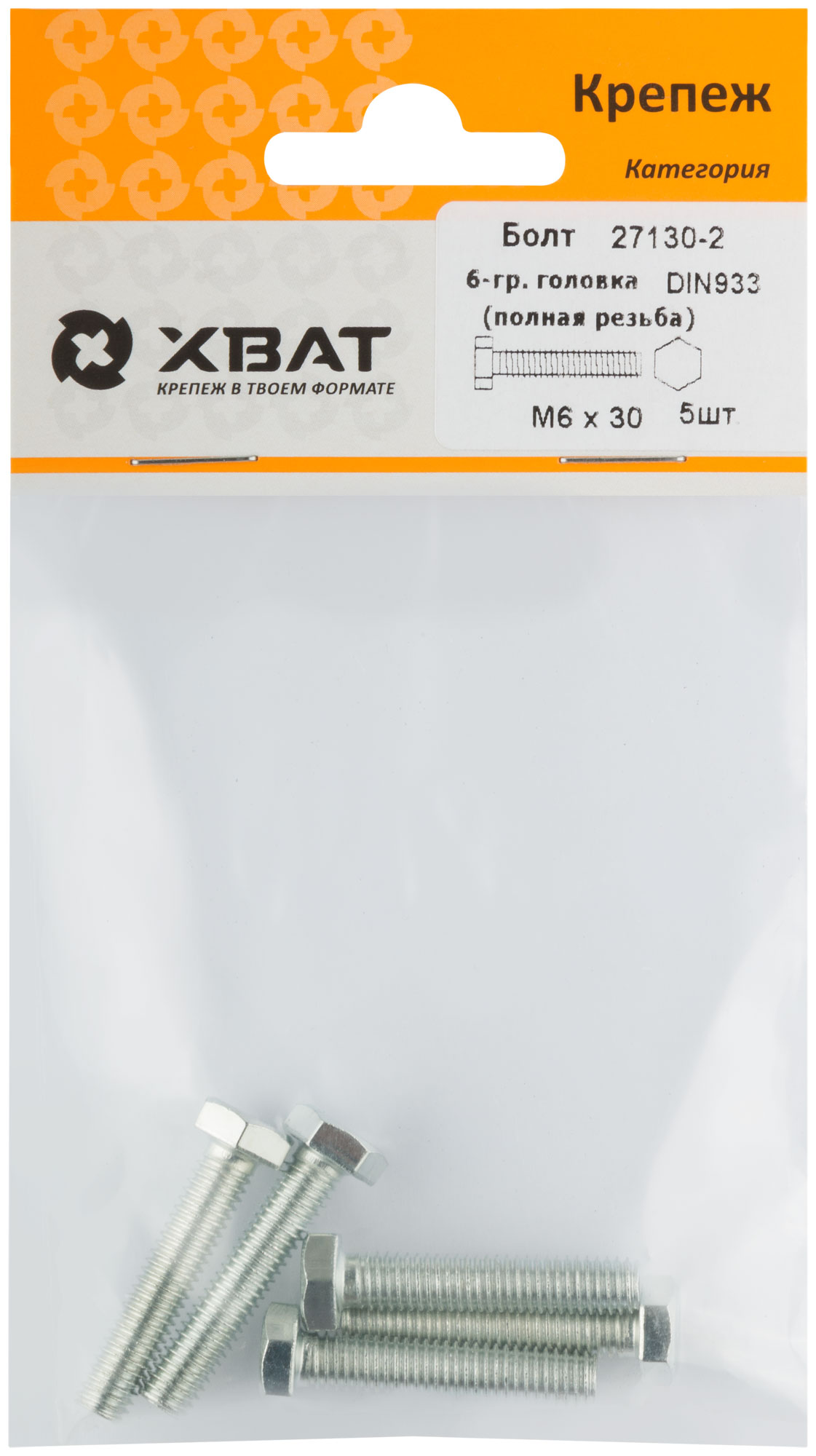 Болт 6-гранная головка (полная резьба) DIN933 М6 х 30 (фасовка 5 шт.)