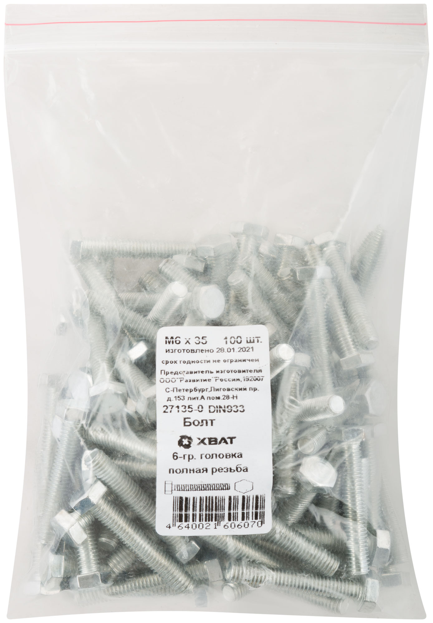 Болт 6-гранная головка (полная резьба) DIN933 М6 х 35 100 шт. Фасовка