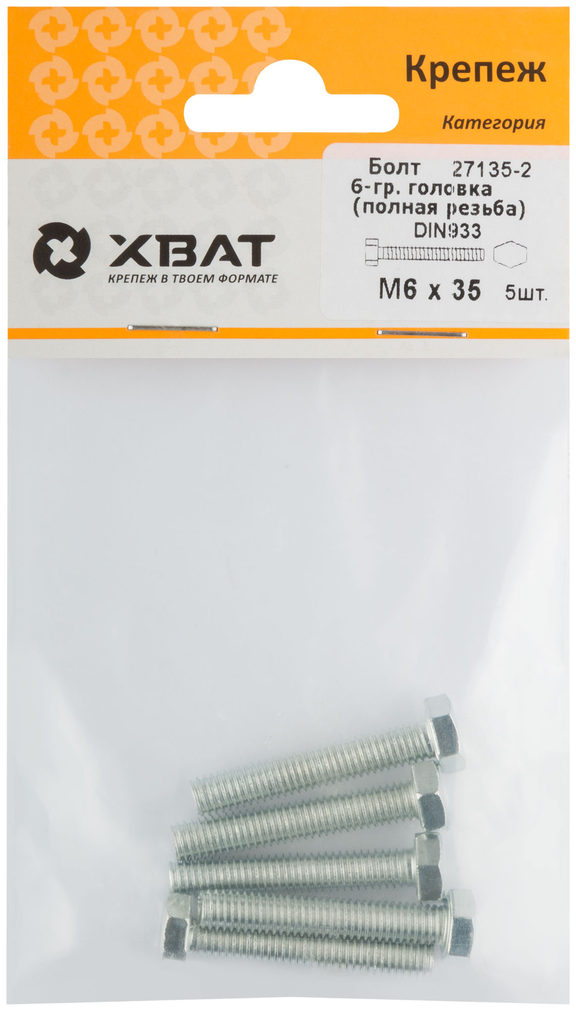 Болт 6-гранная головка (полная резьба) DIN933 М6 х 35 (фасовка 5 шт.)