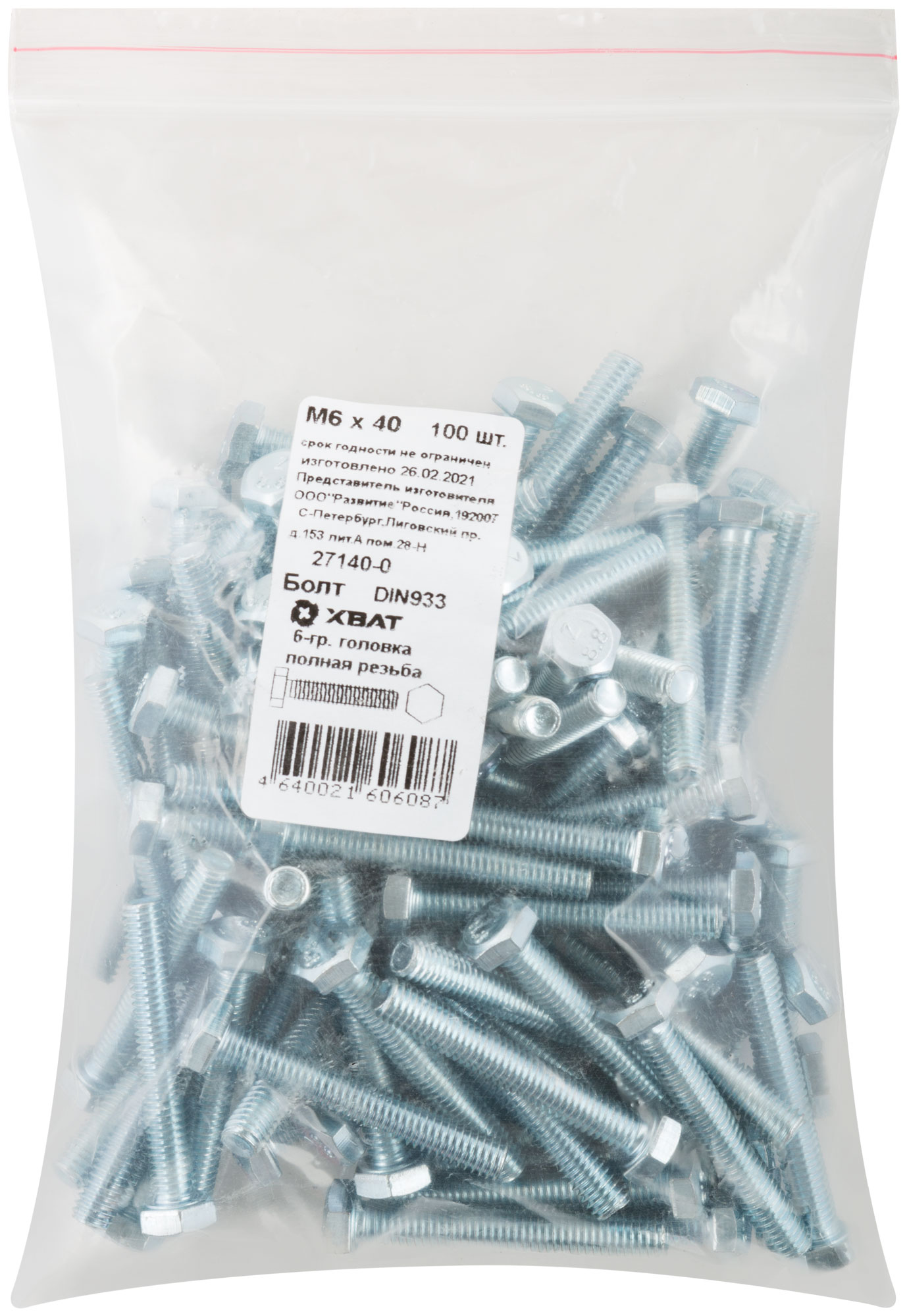 Болт 6-гранная головка (полная резьба) DIN933 М6 х 40 100 шт. Фасовка