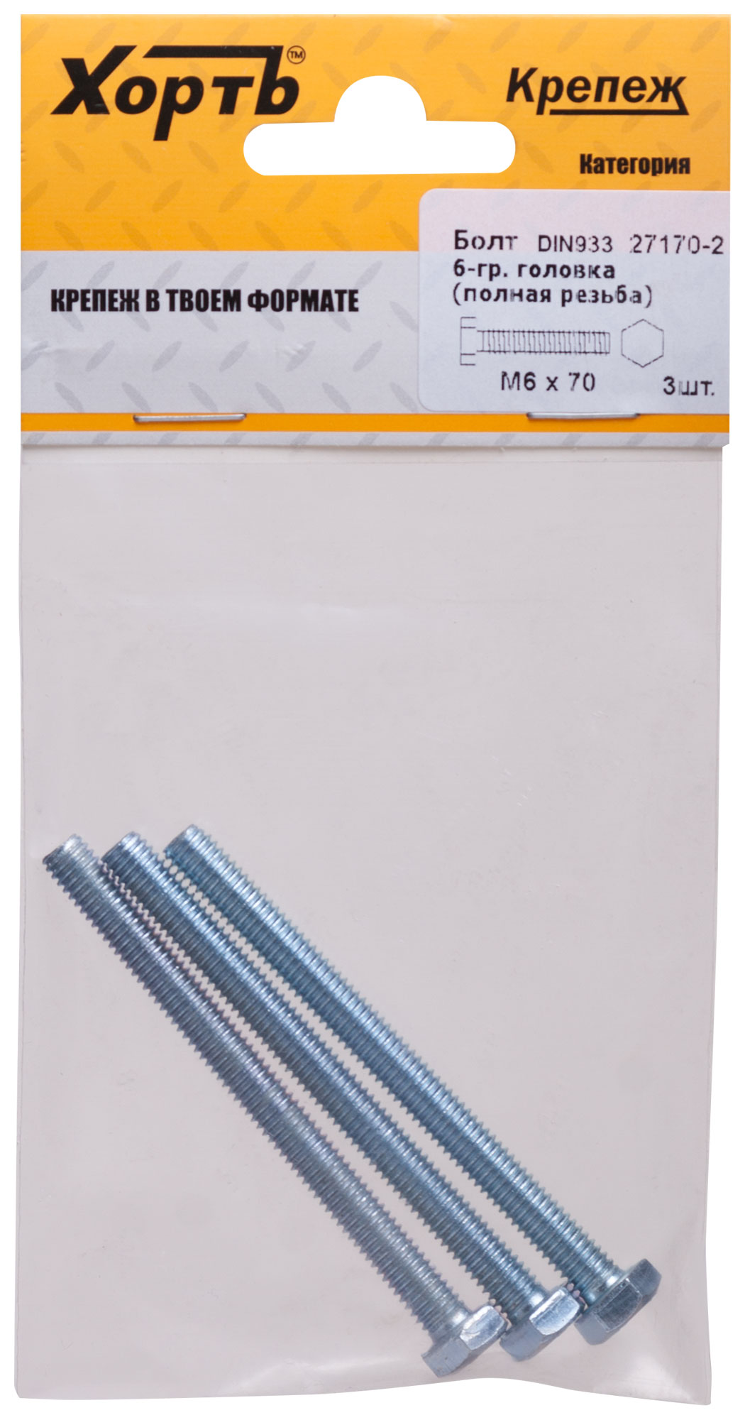 Болт 6-гранная головка (полная резьба) DIN933 М6 х 70 (фасовка 3 шт.)