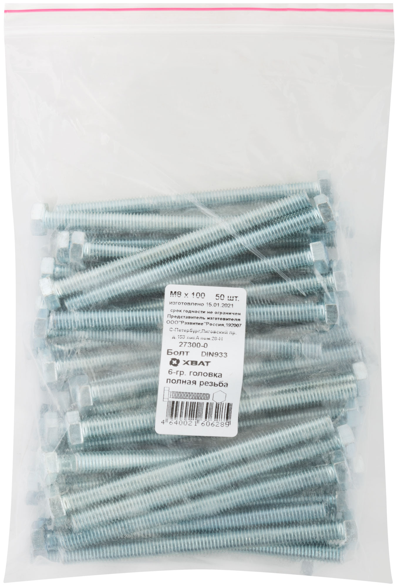 Болт 6-гранная головка (полная резьба) DIN933 М8 х 100 50 шт. Фасовка