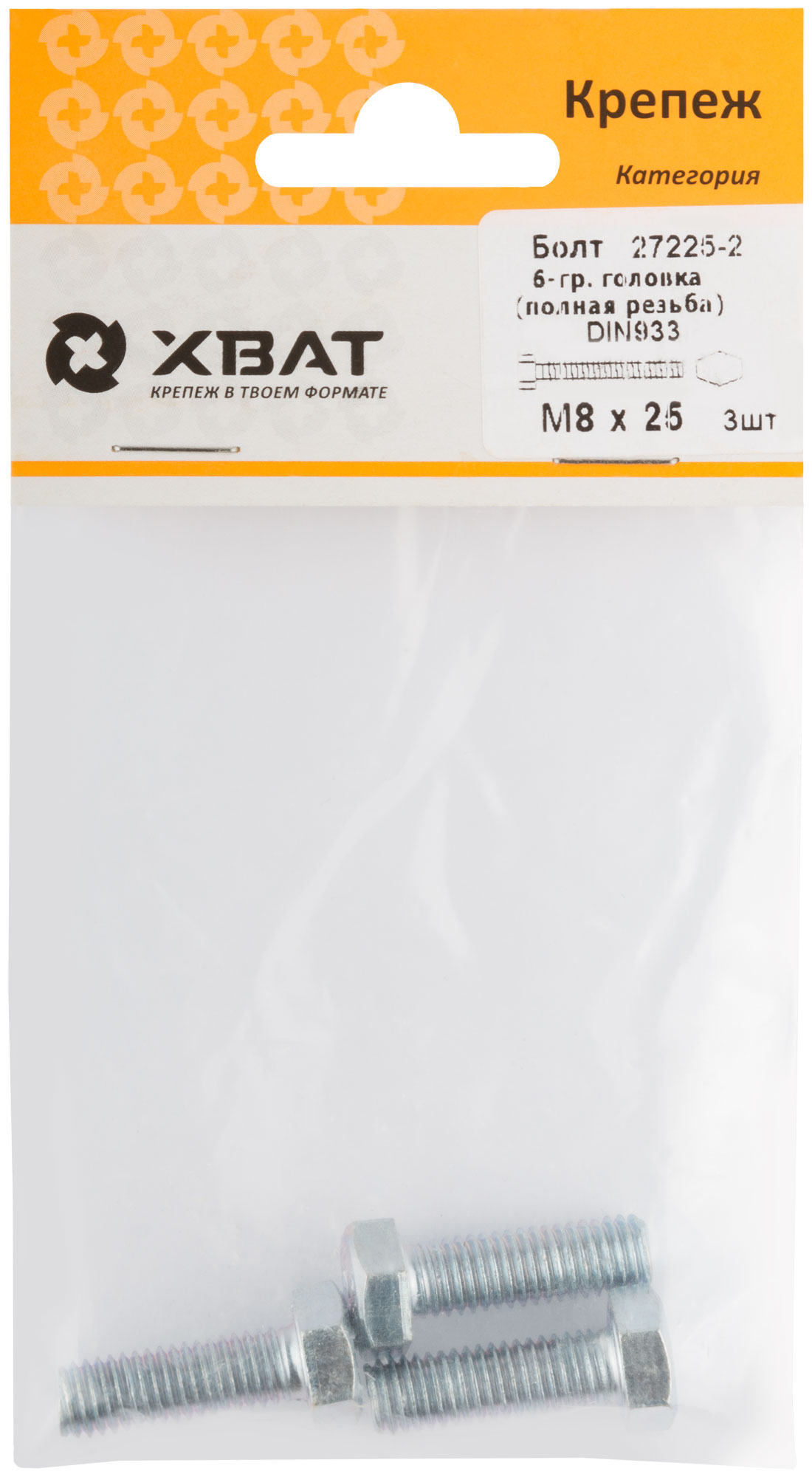 Болт 6-гранная головка (полная резьба) DIN933 М8 х 25 (фасовка 3 шт.)
