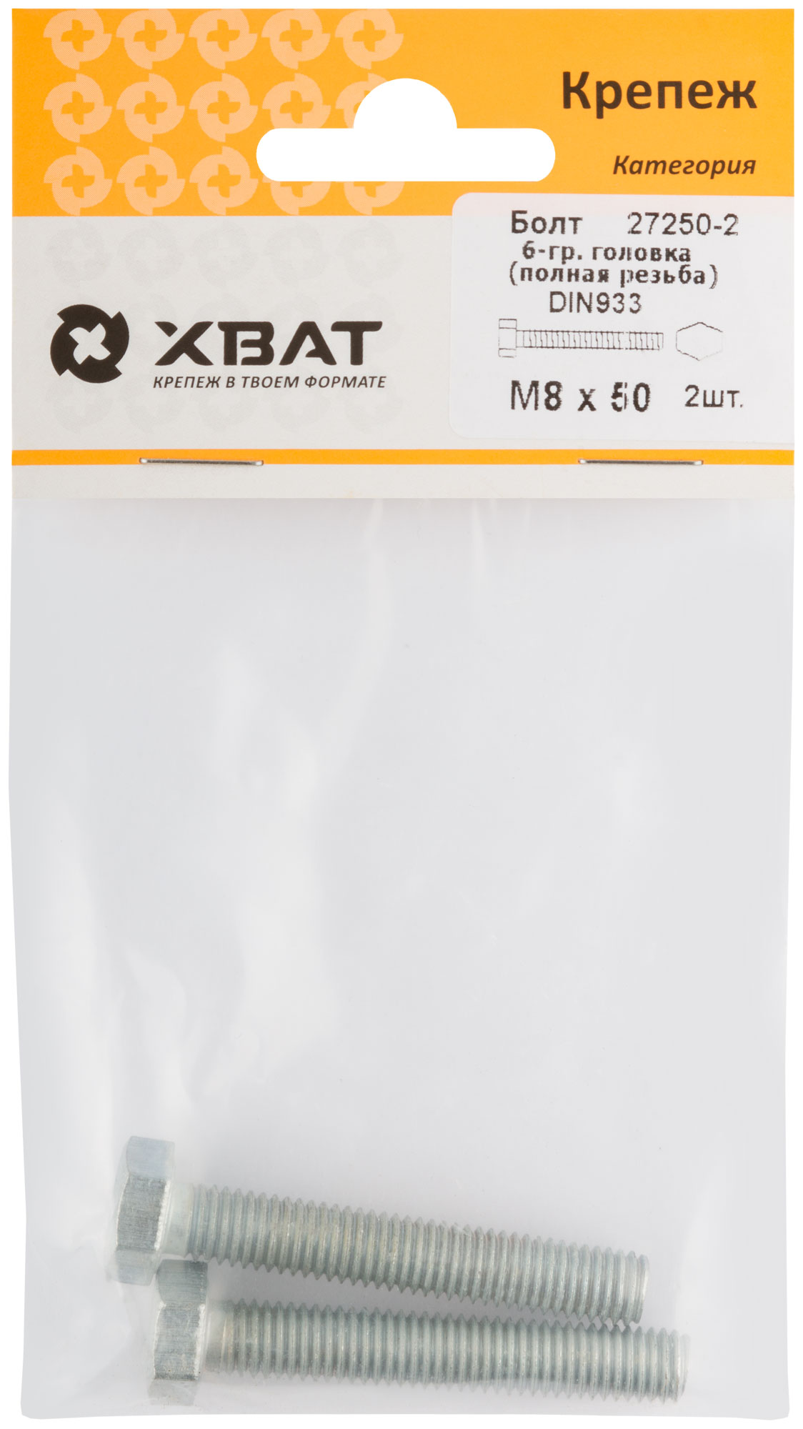 Болт 6-гранная головка (полная резьба) DIN933 М8 х 50 (фасовка 2 шт.)