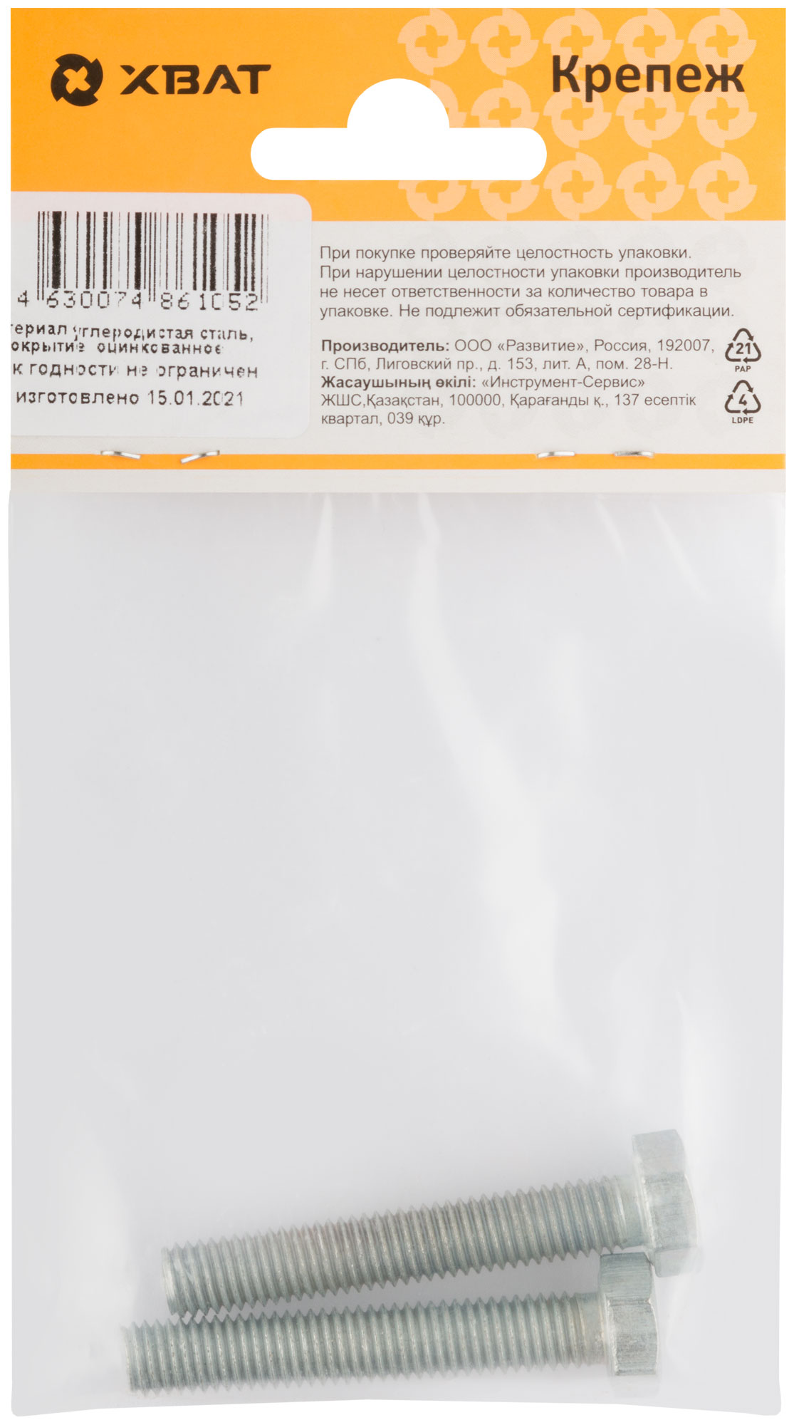 Болт изготовлен из конструкционной оцинкованной стали. Класс прочности 5.8. Рекомендуются для крепления и соединения узлов и деталей в машиностроении, строительстве. Позволяет быстро и качественно произвести монтаж.