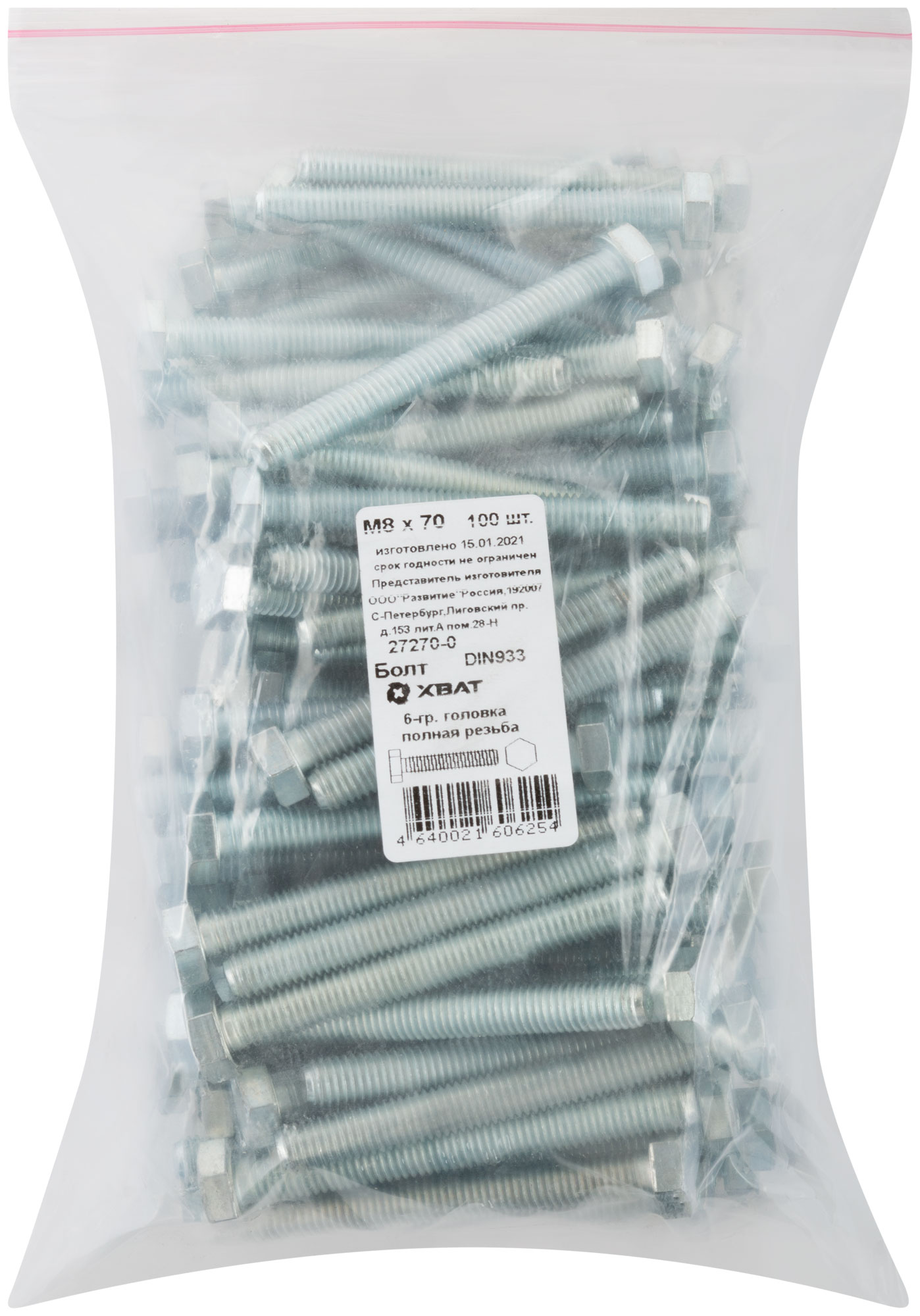Болт 6-гранная головка (полная резьба) DIN933 М8 х 70 100 шт. Фасовка