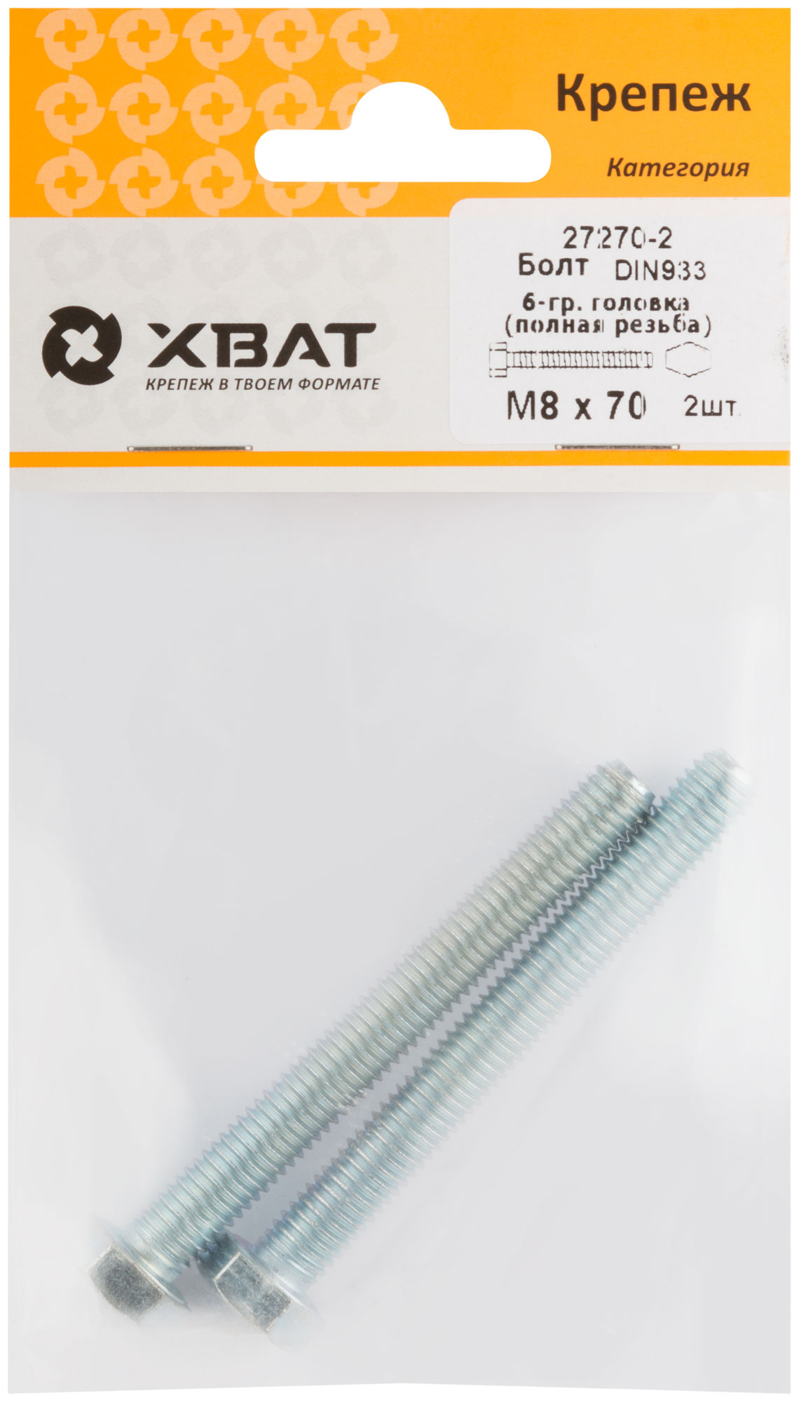 Болт 6-гранная головка (полная резьба) DIN933 М8 х 70 (фасовка 2 шт.)