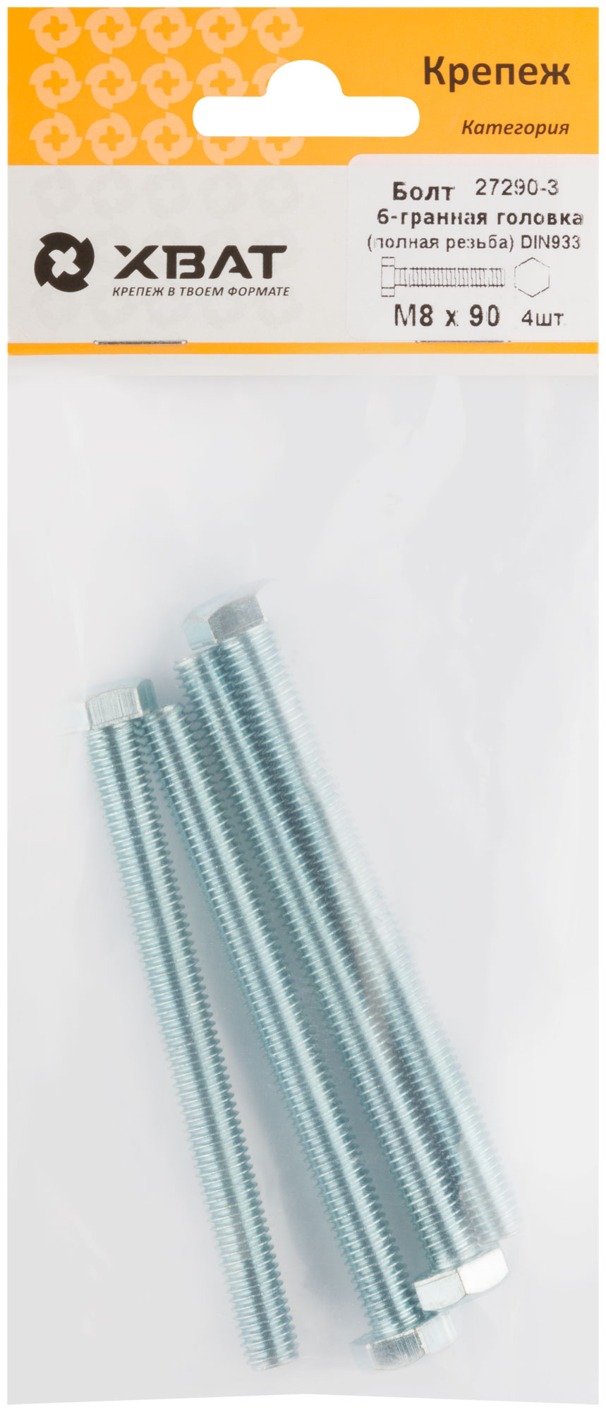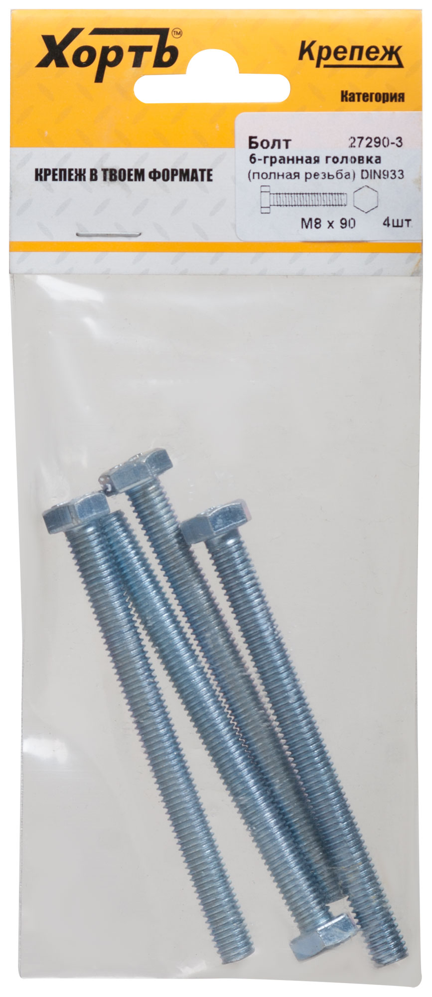 Болт 6-гранная головка (полная резьба) DIN933 М8 х 90 (фасовка 4 шт.)