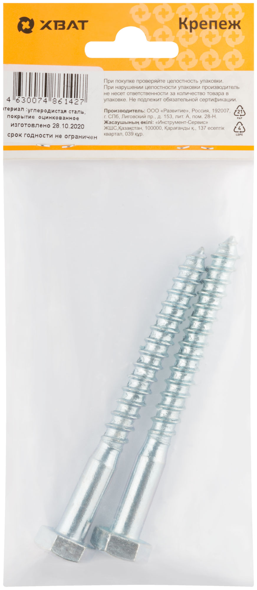 Шестигранная головка D=10/12/14/19. Редкий шаг резьбы под углом 60°, острый наконечник, изготовлен из стали. Оцинкованный. Применяется для крепления лаг, реек, сборки деревянных конструкций, сантехнических креплений и других целей, когда требуется мощное закрепление. Используется также совместно с пластмассовыми и металлическими универсальными дюбелями.