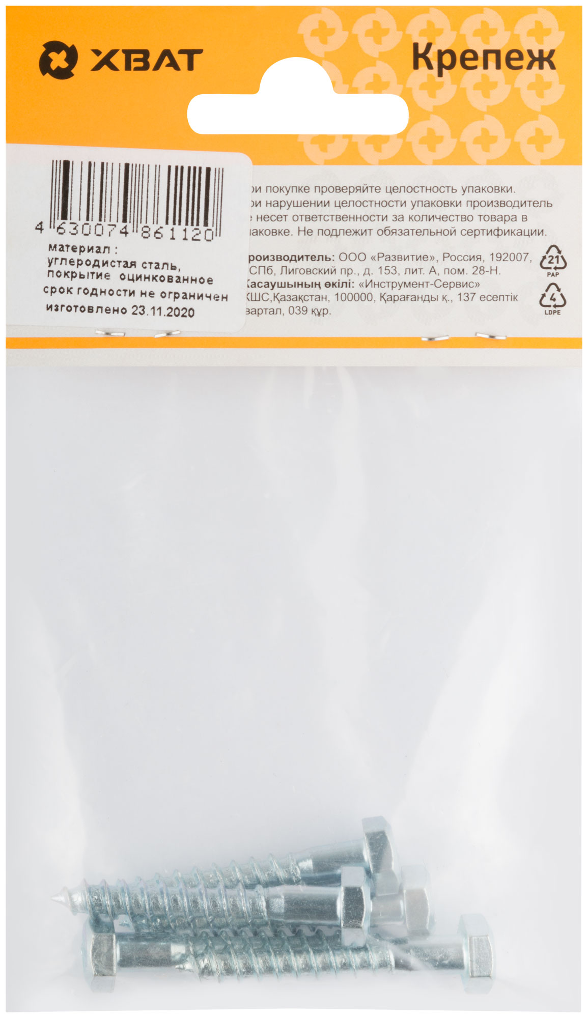 Шестигранная головка D=10/12/14/19. Редкий шаг резьбы под углом 60°, острый наконечник, изготовлен из стали. Оцинкованный. Применяется для крепления лаг, реек, сборки деревянных конструкций, сантехнических креплений и других целей, когда требуется мощное закрепление. Используется также совместно с пластмассовыми и металлическими универсальными дюбелями.