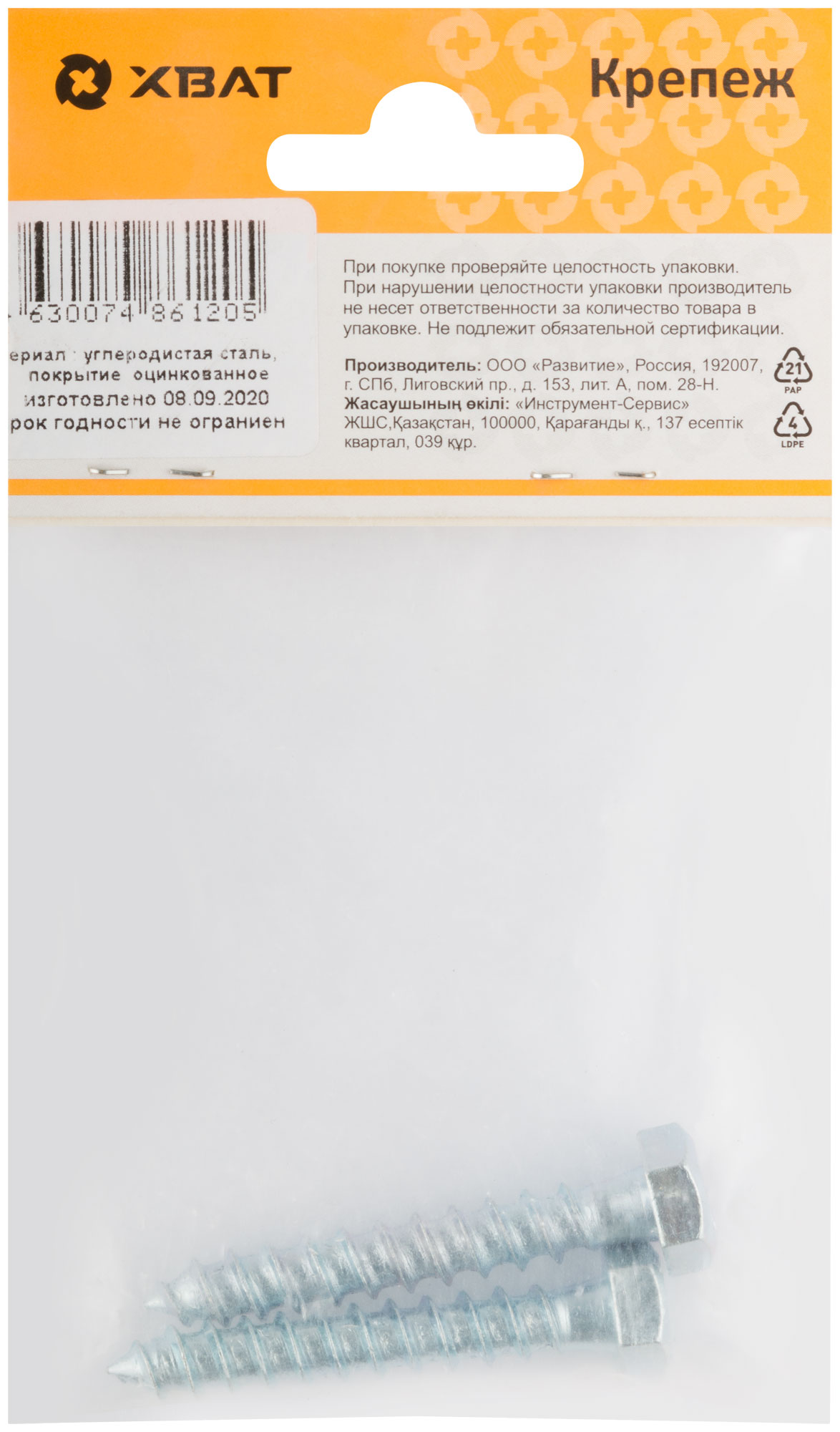 Шестигранная головка D=10/12/14/19. Редкий шаг резьбы под углом 60°, острый наконечник, изготовлен из стали. Оцинкованный. Применяется для крепления лаг, реек, сборки деревянных конструкций, сантехнических креплений и других целей, когда требуется мощное закрепление. Используется также совместно с пластмассовыми и металлическими универсальными дюбелями.