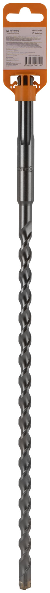Бур по бетону с крестовым наконечником Cutop Profi Plus. Используют в мощных перфораторах с типоразмером хвостовика SDS-Max для сверления твердых пород камня, бетона, армированного бетона, кирпича. Для производства крестового наконечника бура используется сплав карбида вольфрама с добавлением кобальта 8%. Это позволяют производить точные отверстия и гарантирует длительную работу оснастки без изменения диаметра. Дополнительные резцы занижены по диаметру во избежание заклинивания бура. Конструкция спирали позволяет оптимально отводить шлам и предотвращает скапливание отходов в канавках. Спиральная часть бура выполнена из качественной инструментальной стали и проходит специальную термическую обработку. Благодаря этому бур выдерживает высокие нагрузки без риска деформации. При установке в патрон хвостовик необходимо смазывать. Материал: инструментальная сталь.Упаковка: пластиковый подвес.