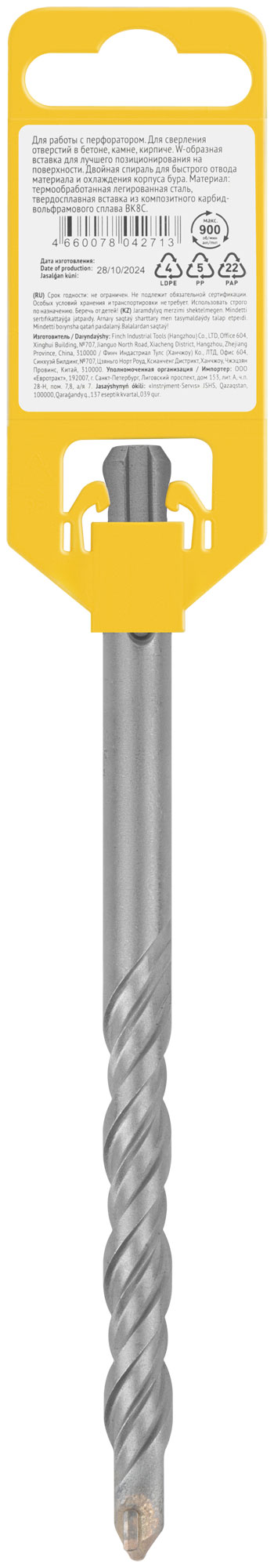 Профи. SDS-PLUS хвостовик. По бетону, камню, кирпичу. Для перфоратора. Для профессионального использования. Износостойкий. W-образная вставка с добавлением 8% кобальта для лучшего позиционирования на поверхности. Двойная спираль для быстрого отвода материала и охлаждения корпуса бура. Материал: легированная инструментальная сталь, твердосплавная вставка из карбида вольфрама ВК8С. Упаковка: пластиковый подвес.