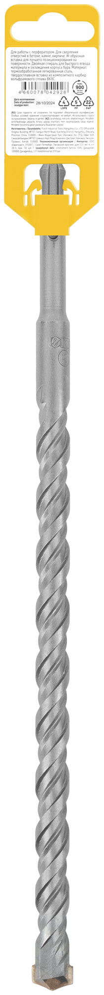 Профи. SDS-PLUS хвостовик. По бетону, камню, кирпичу. Для перфоратора. Для профессионального использования. Износостойкий. W-образная вставка с добавлением 8% кобальта для лучшего позиционирования на поверхности. Двойная спираль для быстрого отвода материала и охлаждения корпуса бура. Материал: легированная инструментальная сталь, твердосплавная вставка из карбида вольфрама ВК8С. Упаковка: пластиковый подвес.