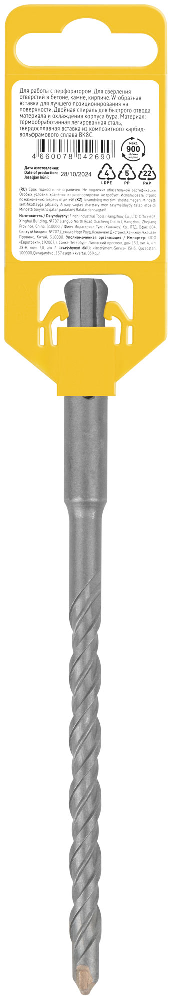 Профи. SDS-PLUS хвостовик. По бетону, камню, кирпичу. Для перфоратора. Для профессионального использования. Износостойкий. W-образная вставка с добавлением 8% кобальта для лучшего позиционирования на поверхности. Двойная спираль для быстрого отвода материала и охлаждения корпуса бура. Материал: легированная инструментальная сталь, твердосплавная вставка из карбида вольфрама ВК8С. Упаковка: пластиковый подвес.