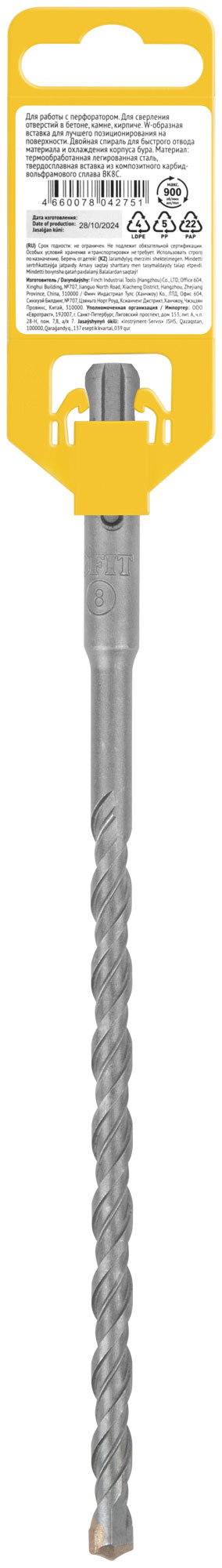 Бур по бетону SDS PLUS, Профи, W-образная вставка, двойная спираль, 8 х 210 мм