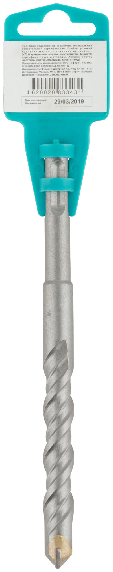 SDS-PLUS хвостик. Для сверления отверстий в бетоне, камне, кирпиче. Двойная спираль. Материал : легированная инструментальная сталь, карбиднаявставка. Упаковка: пластиковый подвес .
