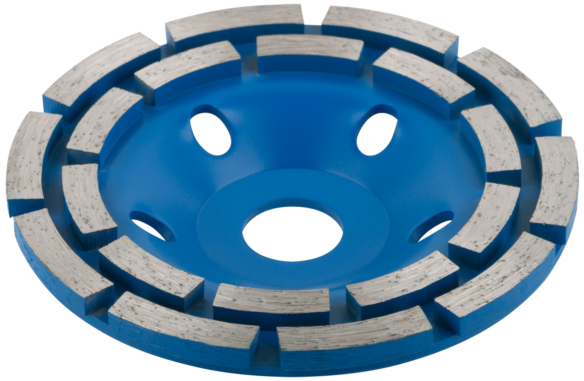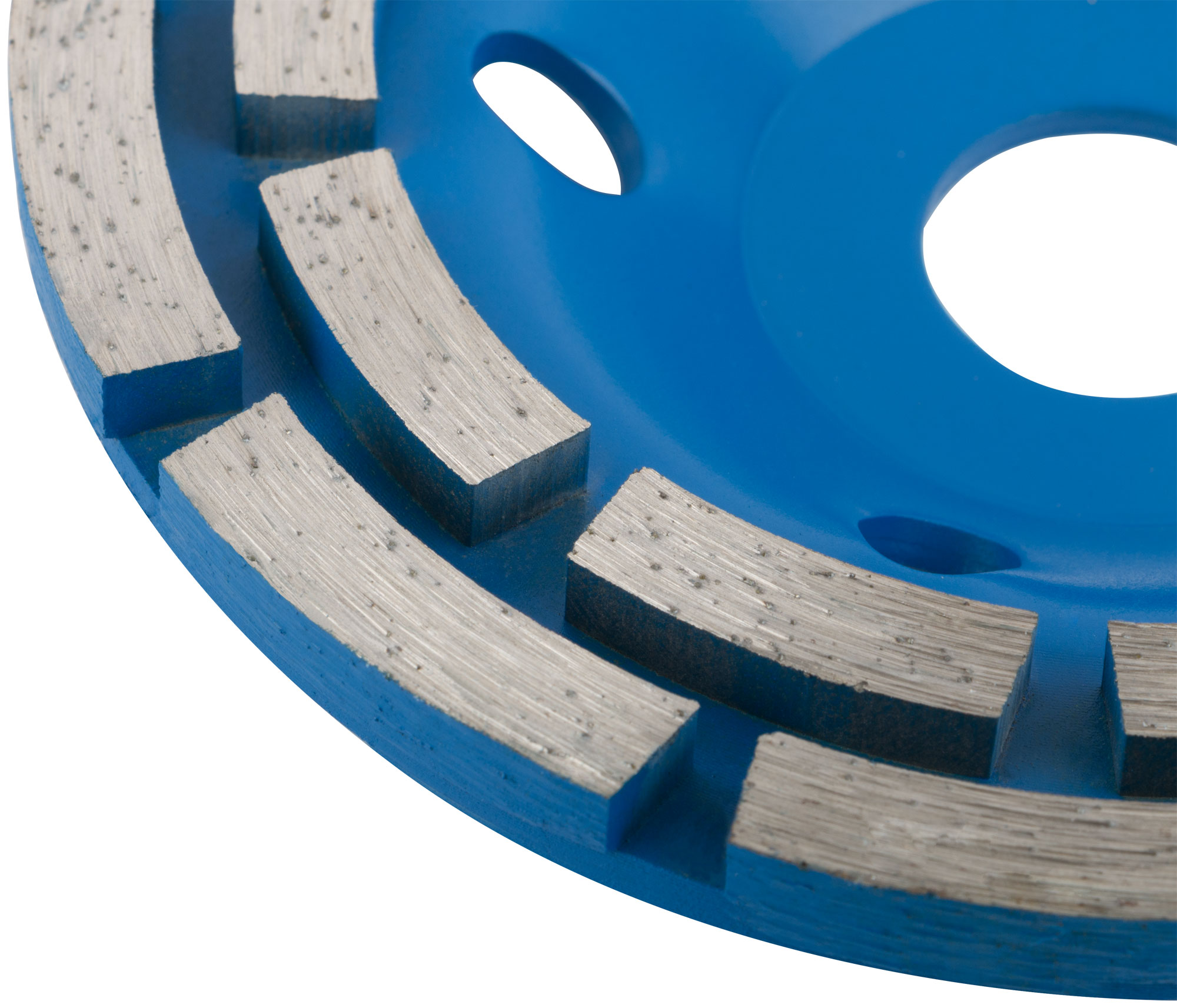 Два ряда сегментов. Для использования с УШМ. Посадочный диаметр 22,2 мм. Для устранения неровностей, зачистки и шлифовки бетона, камня, кирпича и аналогичных строительных материалов. Материал: инструментальная сталь, режущая кромка - расплав с техническимиалмазами. Упаковка: блистер.
