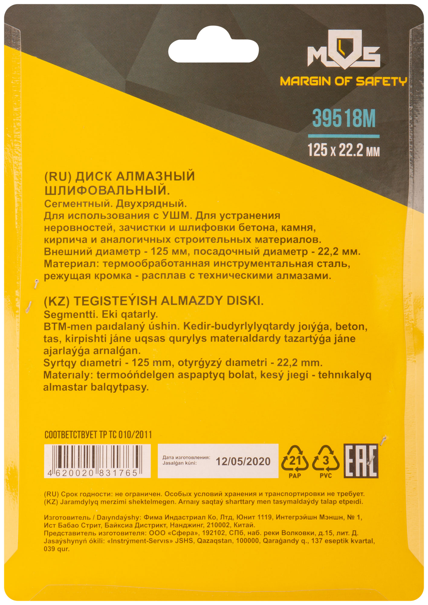 Диск алмазный шлифовальный, посадочный диаметр 22,2 мм, два ряда сегментов 125 мм