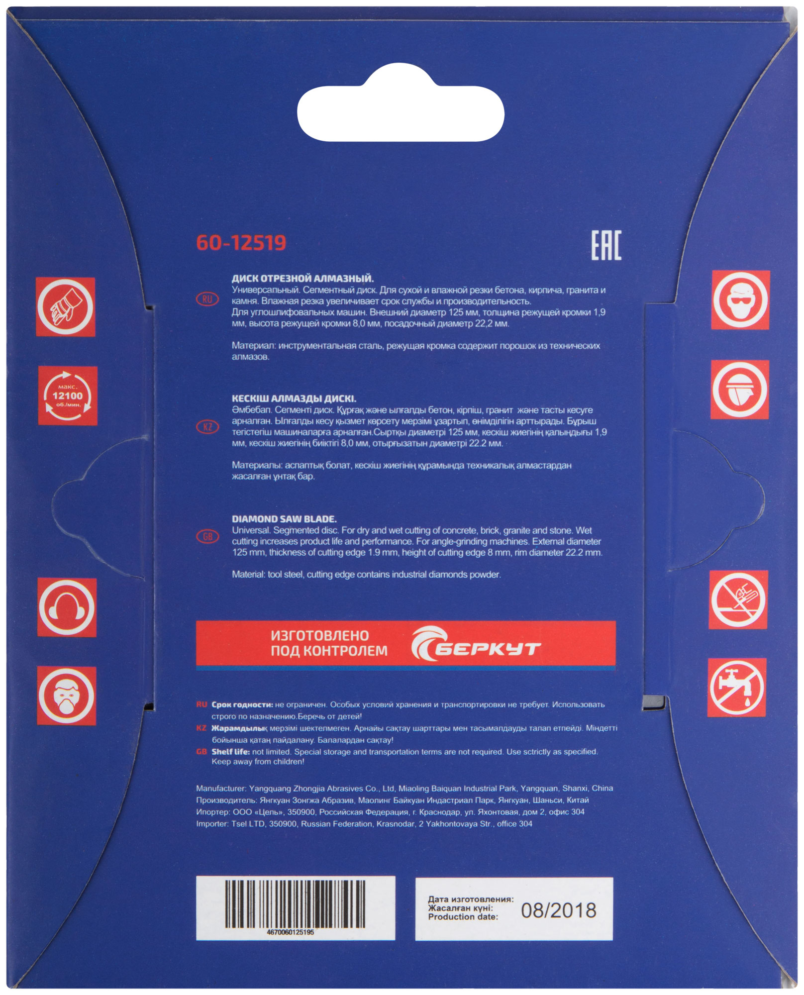 Сегментный. Универсальный. Для сухой и влажной резки бетона, кирпича, гранита, мрамора и камня. Посадочный диаметр 22,2 мм. Материал: инструментальная сталь, режущая кромка содержит порошок из технических алмазов. Упаковка: картонный конверт.