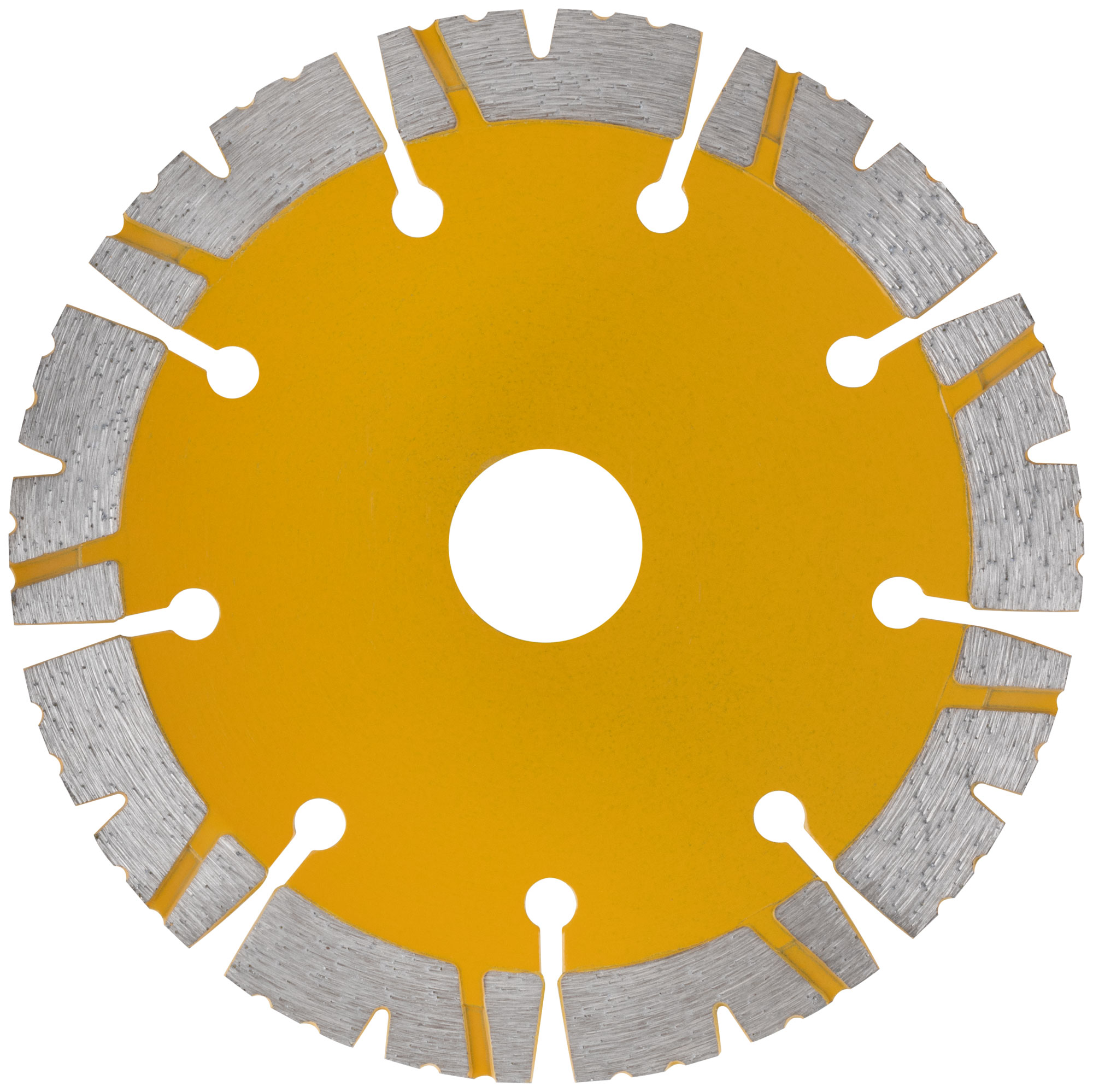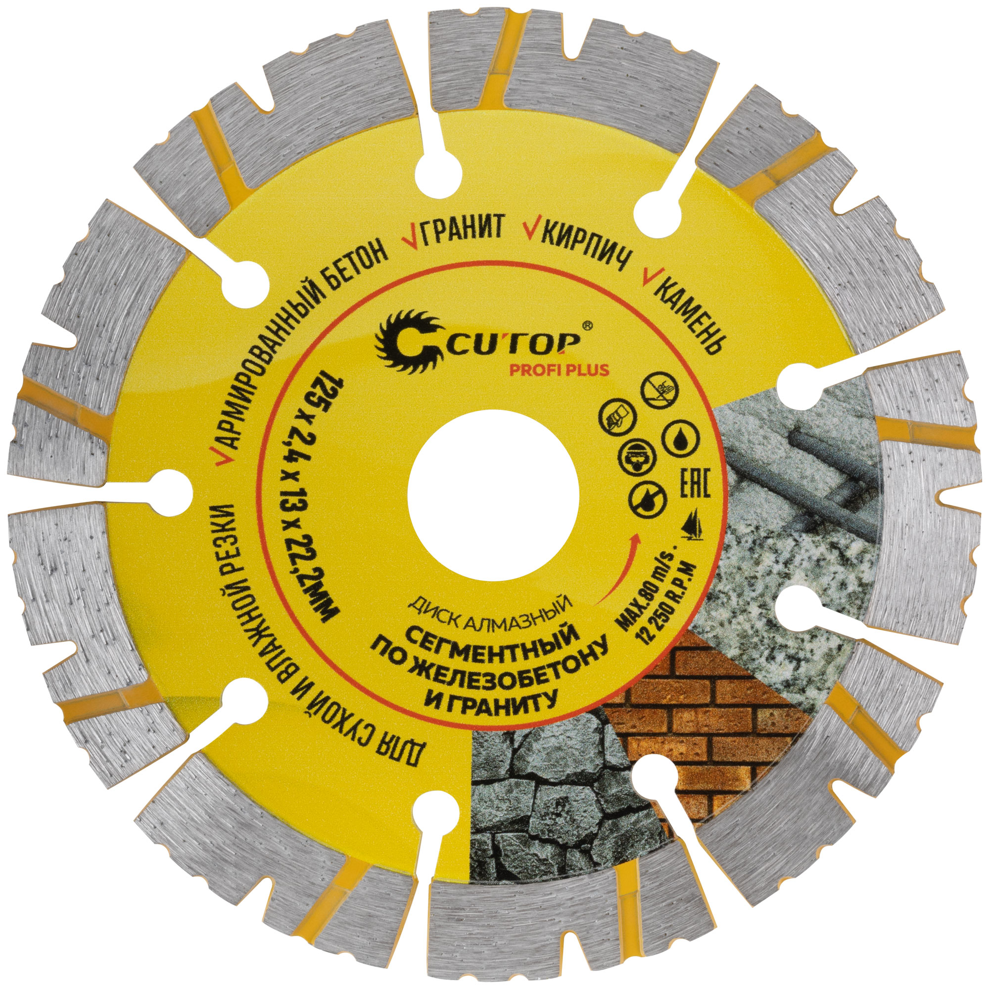 Для резки камня, кирпича, гранита, армированного бетона. Перфорация корпуса диска способствует дополнительному охлаждению. Изготовлен методом горячего прессования, что обеспечивает большую твердость и более длительный срок службы диска в сравнении с методом холодного прессования. Диски характеризуются повышенной концентрацией алмазов, улучшенным качеством алмазных зерен и оптимально подобранной металлической связкой. Эти преимущества обеспечивают высокую производительность и увеличенный срок службы. Материал: инструментальная сталь, режущая кромка содержит порошок из технических алмазов. Упаковка: блистер.