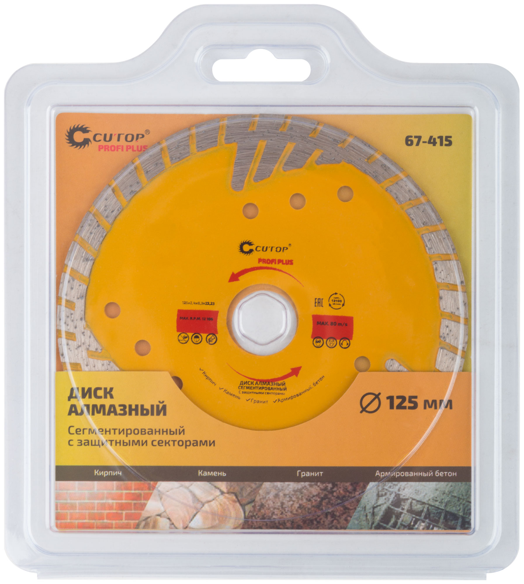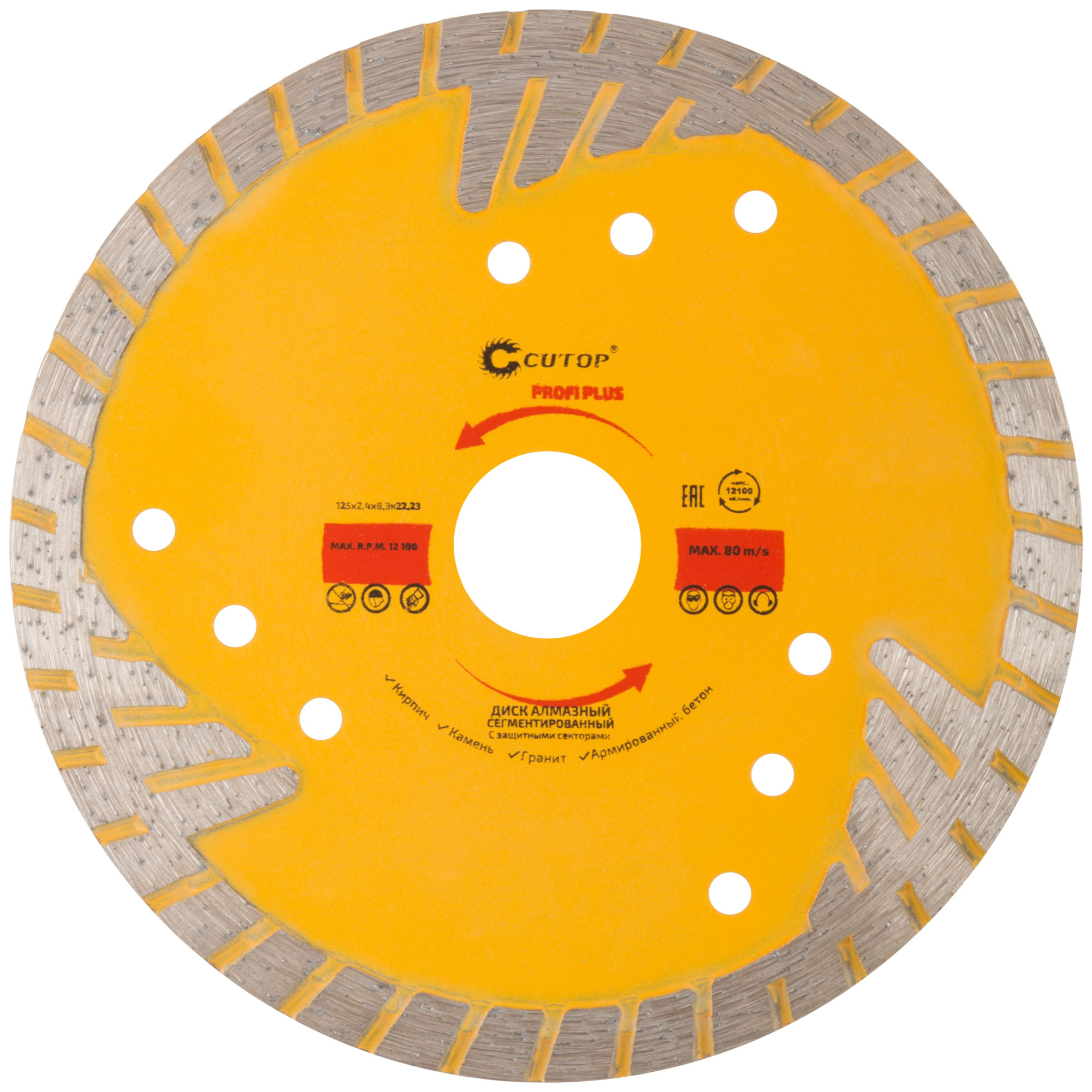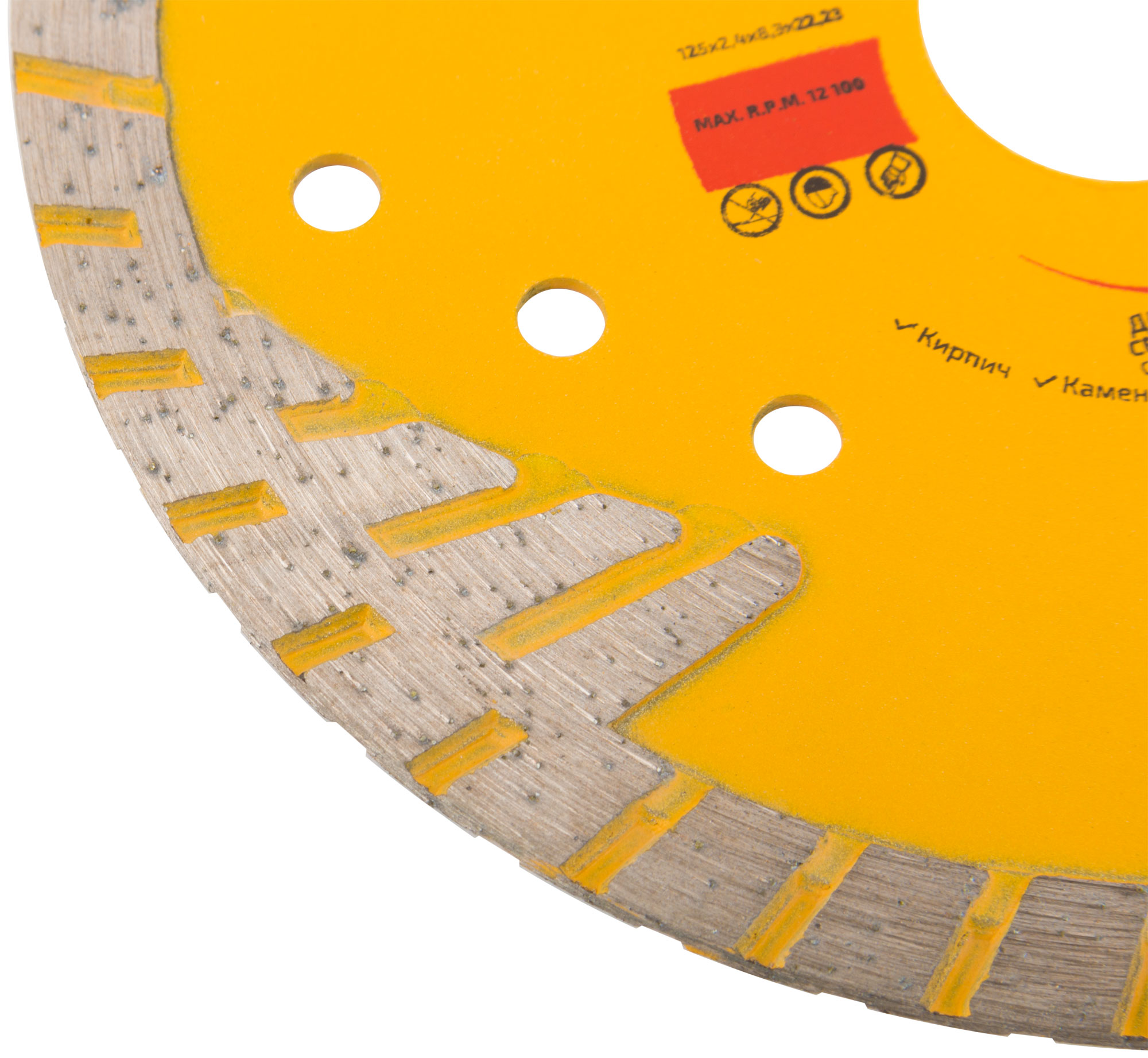 Для резки армированного бетона, керамической плитки, гранита, кирпича, камня. Защитные сектора диска обеспечивают защиту режущего слоя от бокового износа. Изготовлен методом горячего прессования, что обеспечивает большую твердость и более длительный срок службы диска в сравнении с методом холодного прессования. Диски характеризуются повышенной концентрацией алмазов, улучшенным качеством алмазных зерен и оптимально подобранной металлической связкой. Эти преимущества обеспечивают высокую производительность и увеличенный срок службы. Материал: инструментальная сталь, режущая кромка содержит порошок из технических алмазов. Упаковка: двойной блистер.