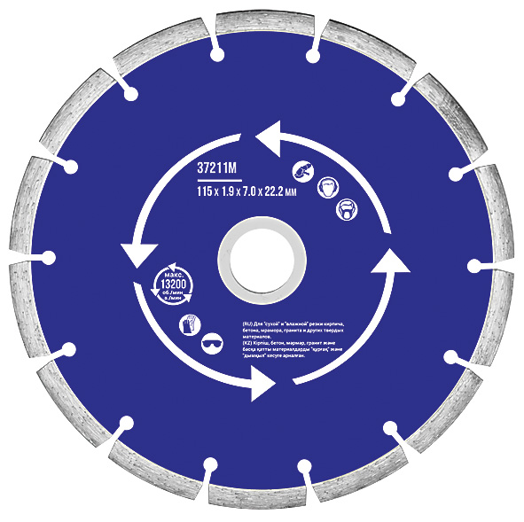 Сегментный. Для использования с УШМ . Посадочный диаметр 22,2мм. Для "сухой" и "влажной"резки кирпича, бетона, мрамора,гранита и других твердых материалов. Сегментная режущая кромка обеспечивает охлаждение диска в процессе работы, предотвращая его перегрев. Материал: инструментальная сталь, режущая кромка-расплав с техническими алмазами. Уп: Блистер