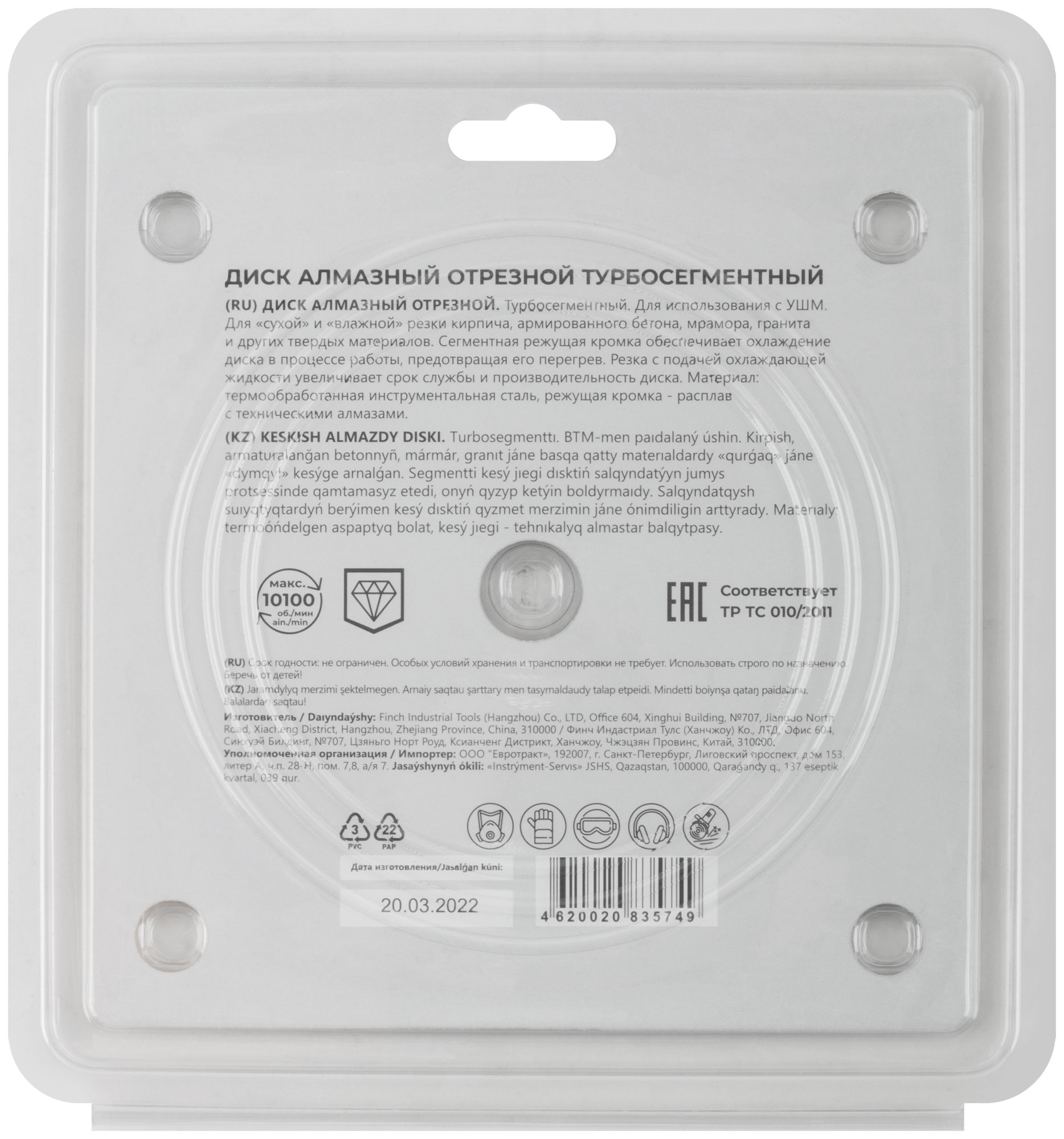 Турбосегментный. Для использования с УШМ. Посадочный диаметр 22,2 мм. Для «сухой» и «влажной» резки кирпича, бетона, армированного бетона, мрамора, гранита и других твердых материалов. Сегментная алмазная режущая кромка, с "турбо" профилем высотой 10 мм, увеличивает скорость реза и способствует более эффективному удалению отработанного материала, предотвращая перегрев диска. Материал: инструментальная сталь, режущая кромка - расплав с техническими алмазами. Упаковка: блистер.