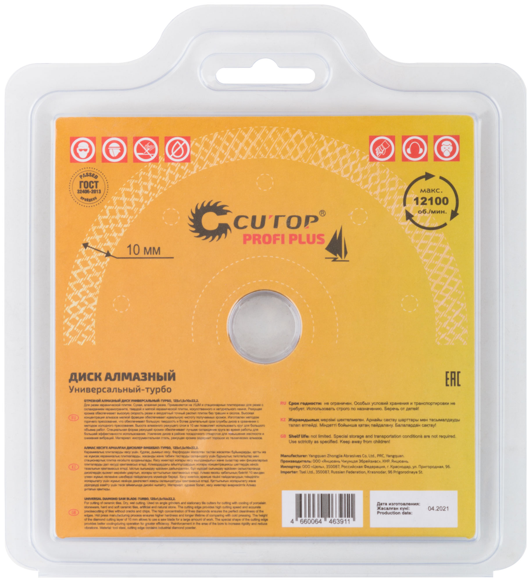 Для резки керамической плитки. Сухая, влажная резка. Применяется на УШМ и стационарных плиткорезах для резки с охлаждением керамогранита, твердой и мягкой керамической плитки, искусственного и натурального камня. Режущая кромка обеспечивает высокую скорость резки и аккуратный точный распил плитки без трещин и сколов. Высокая концентрация алмазов мелкой фракции обеспечивает идеальную чистоту получаемых кромок. Изготовлен методом горячего прессования, что обеспечивает большую твердость и более длительный срок службы диска в сравнении с методом холодного прессования. Высота алмазного режущего слоя в 10 мм позволяет использовать круг для большого объема работ. Специальная форма режущей кромки обеспечивает лучшее охлаждение круга во время работы для большей эффективности использования. Усиление диска в районе посадочного отверстия для повышения жесткости и снижения вибраций. Материал: инструментальная сталь, режущая кромка содержит порошок из технических алмазов. Упаковка: блистер.