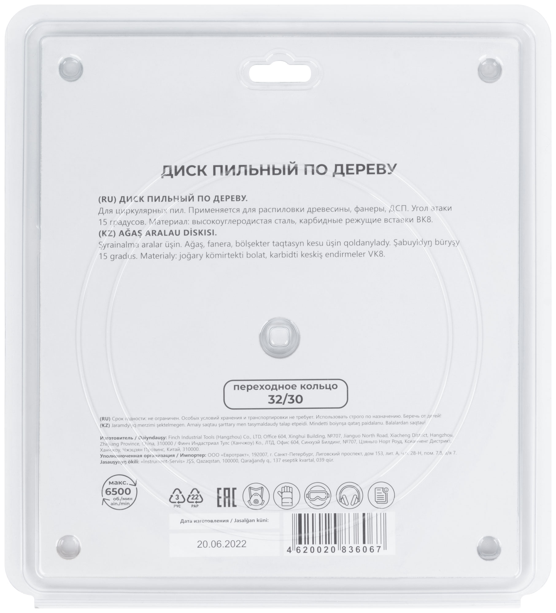 По дереву. Зубья из твердого сплава ВК8 (карбид вольфрама). Корпус из легированной высокоуглеродистой стали. Угол атаки +15°. Упаковка: блистер.