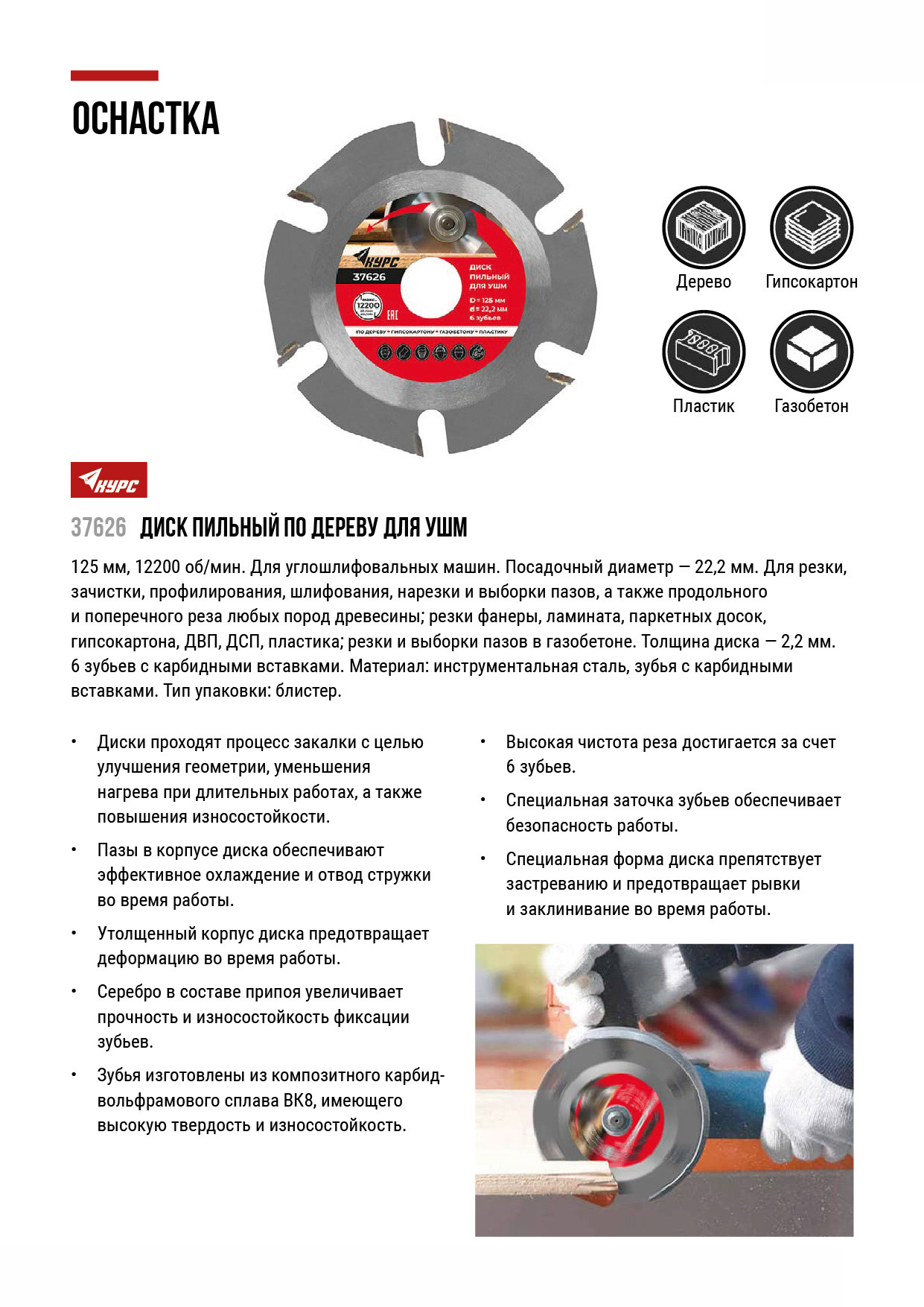 По дереву, газобетону, гипсокартону, пластмассе. Для углошлифовальных машин. Посадочный диаметр 22,2 мм. 6 зубьев с карбидными вставками скошенного типа. Чистый рез. Специальная форма диска толщиной 2,2 мм препятствует застреванию в материале. Материал: инструментальная сталь, зубья с карбидными вставками. Упаковка: картонный конверт.