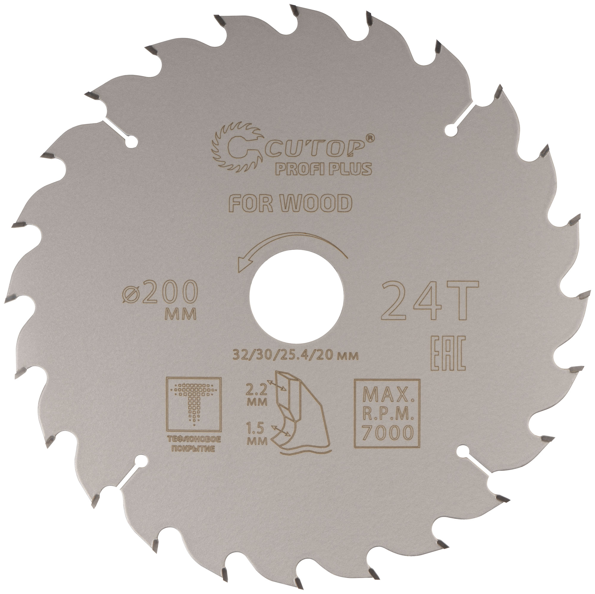 Диск пильный по дереву с тефлоновым покрытием 24Т, CUTOP Profi plus, 200 х 1,5/2,2 х 32/30/25,4/20 мм