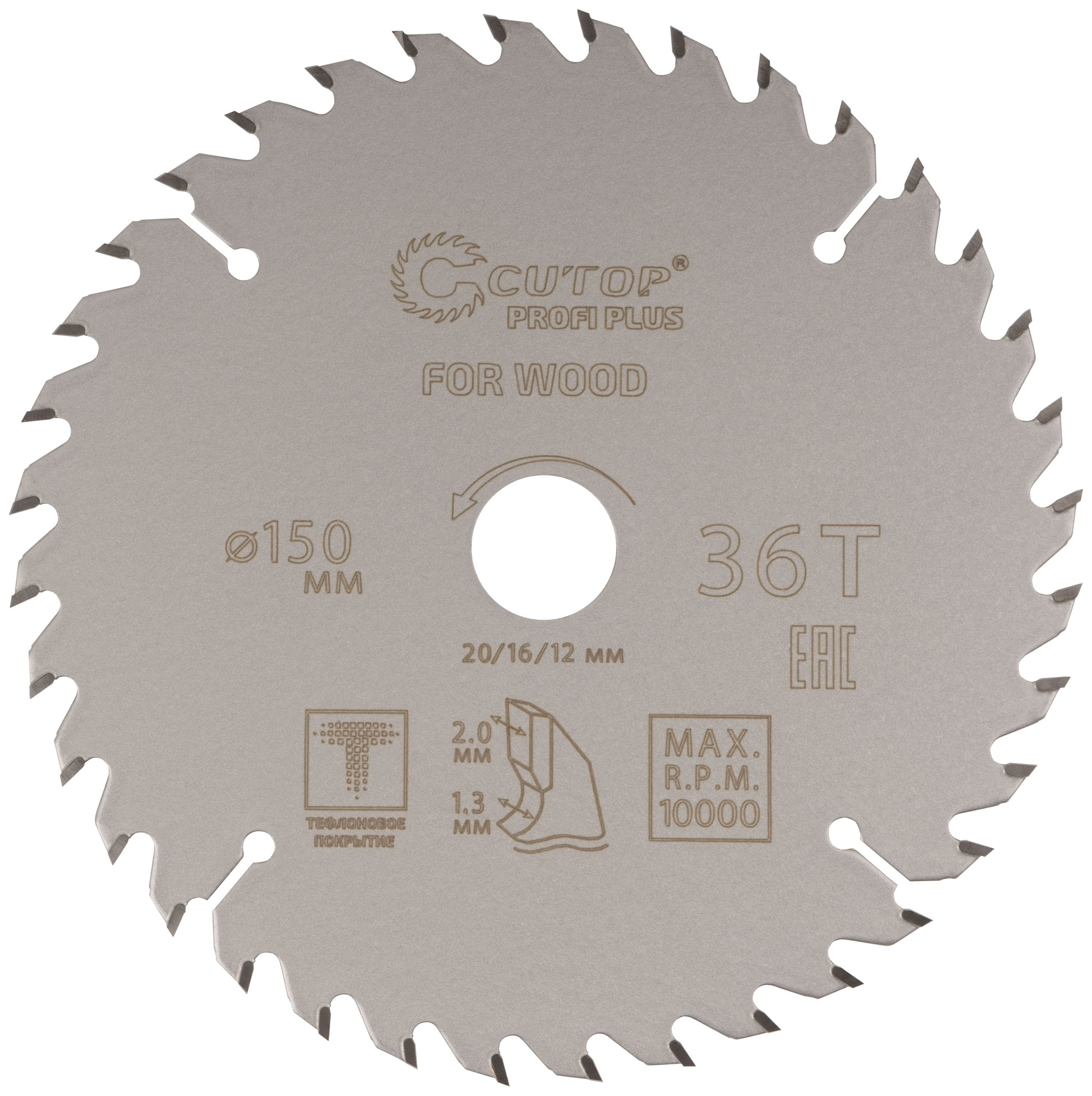 Диск пильный по дереву с тефлоновым покрытием 36Т, CUTOP Profi plus, 150 х 1,3/2,0 х 20/16/12 мм