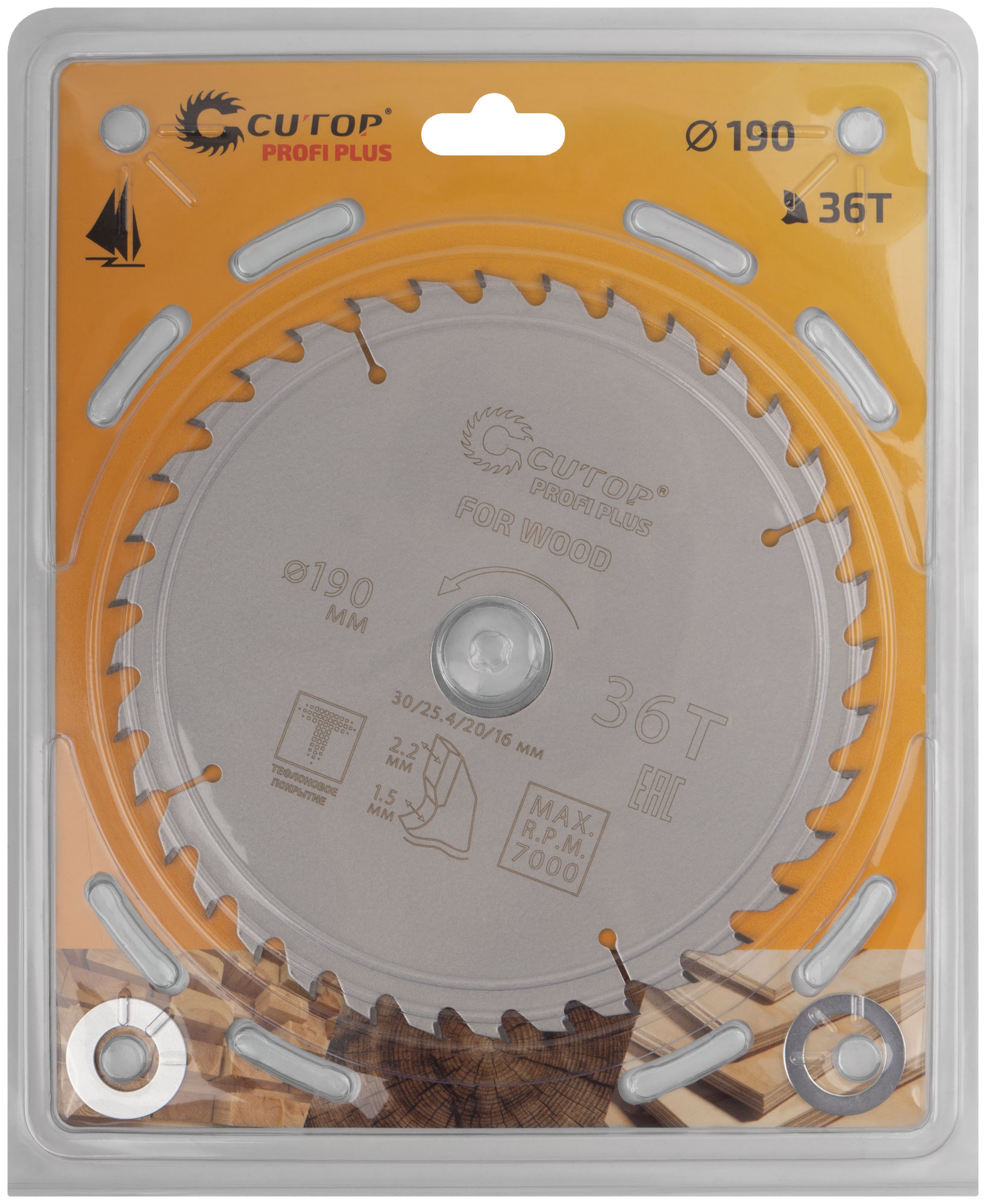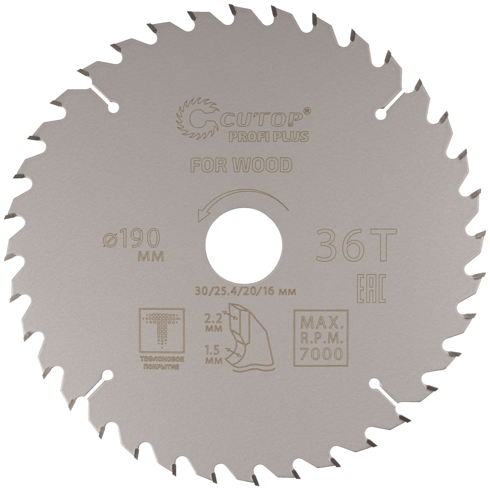Диск пильный по дереву с тефлоновым покрытием 36Т, CUTOP Profi plus, 190 х 1,5/2,2 х 30/25,4/20/16 мм