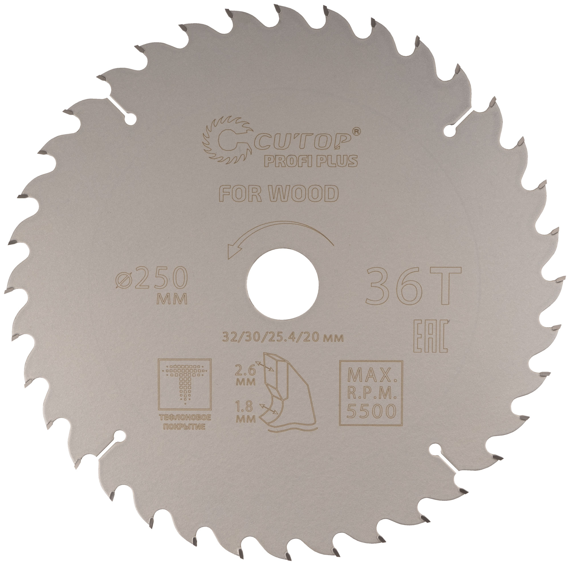 Диск пильный по дереву с тефлоновым покрытием 36Т, CUTOP Profi plus, 250 х 1,8/2,6 х 32/30/25,4/20 мм