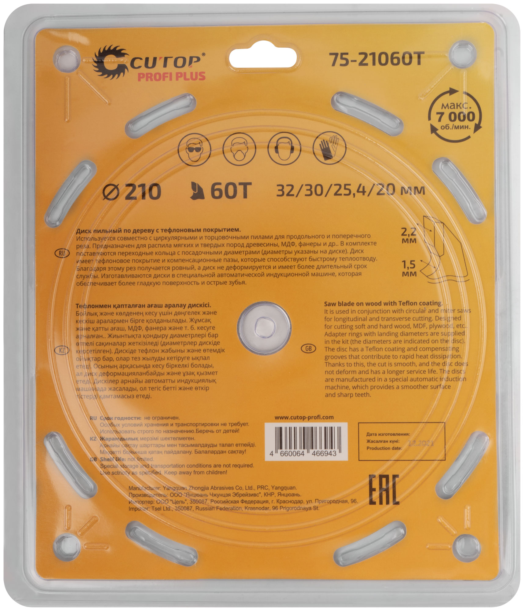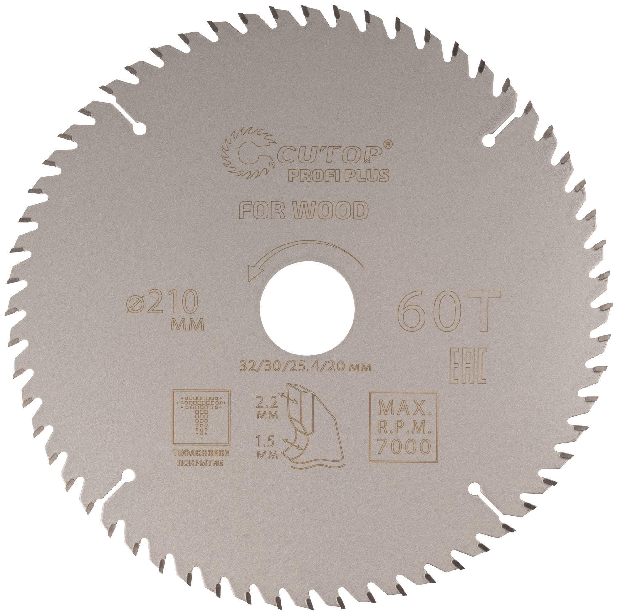 Диск пильный по дереву с тефлоновым покрытием 60Т, CUTOP Profi plus, 210 х 1,5/2,2 х 32/30/25,4/20 мм