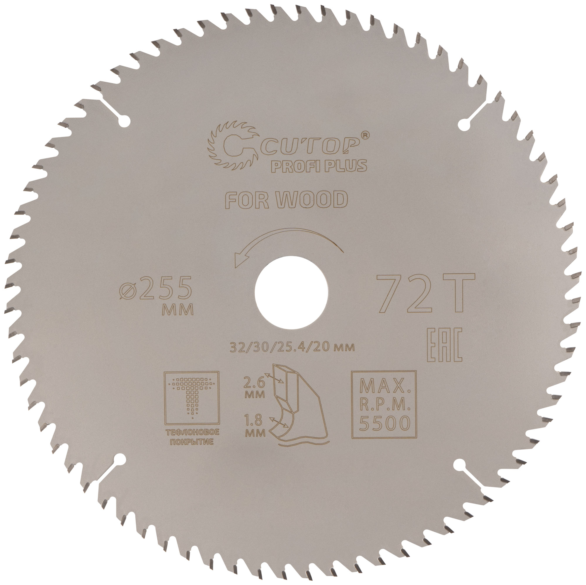 Диск пильный по дереву с тефлоновым покрытием 72Т, CUTOP Profi plus, 255 х 1,8/2,6 х 32/30/25,4/20 мм