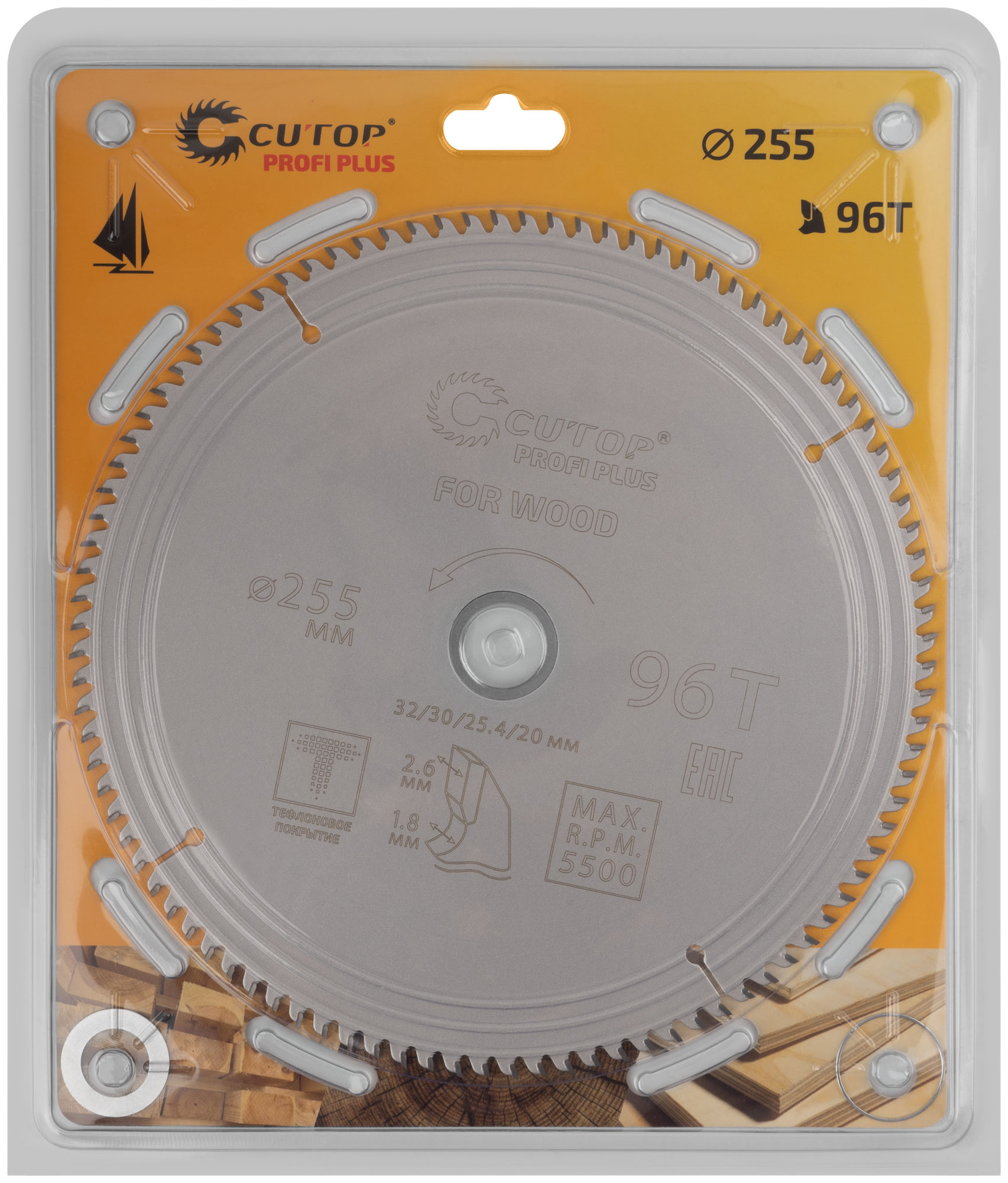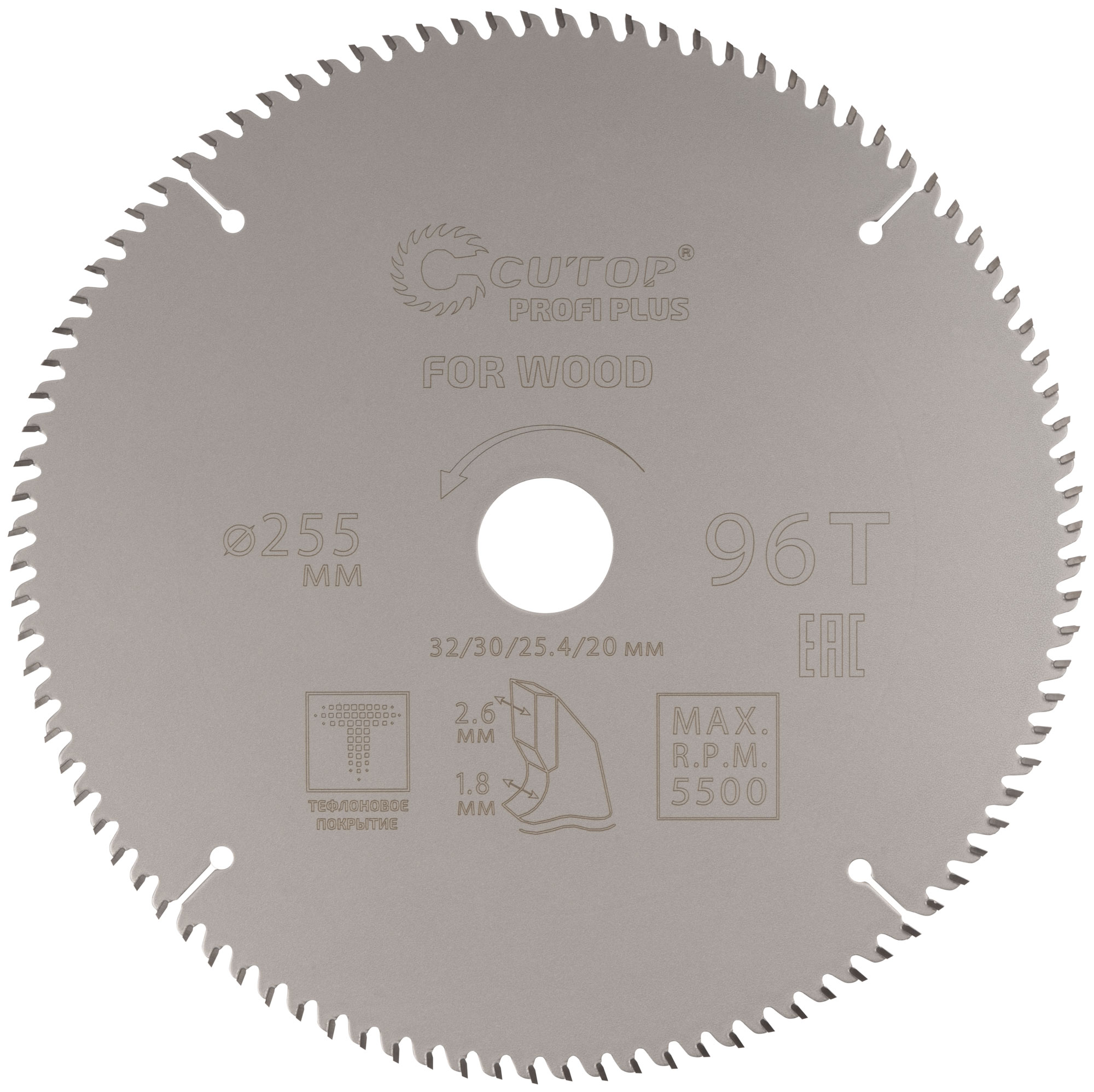 Диск пильный по дереву с тефлоновым покрытием 96Т, CUTOP Profi plus, 255 х 1,8/2,6 х 32/30/25,4/20 мм