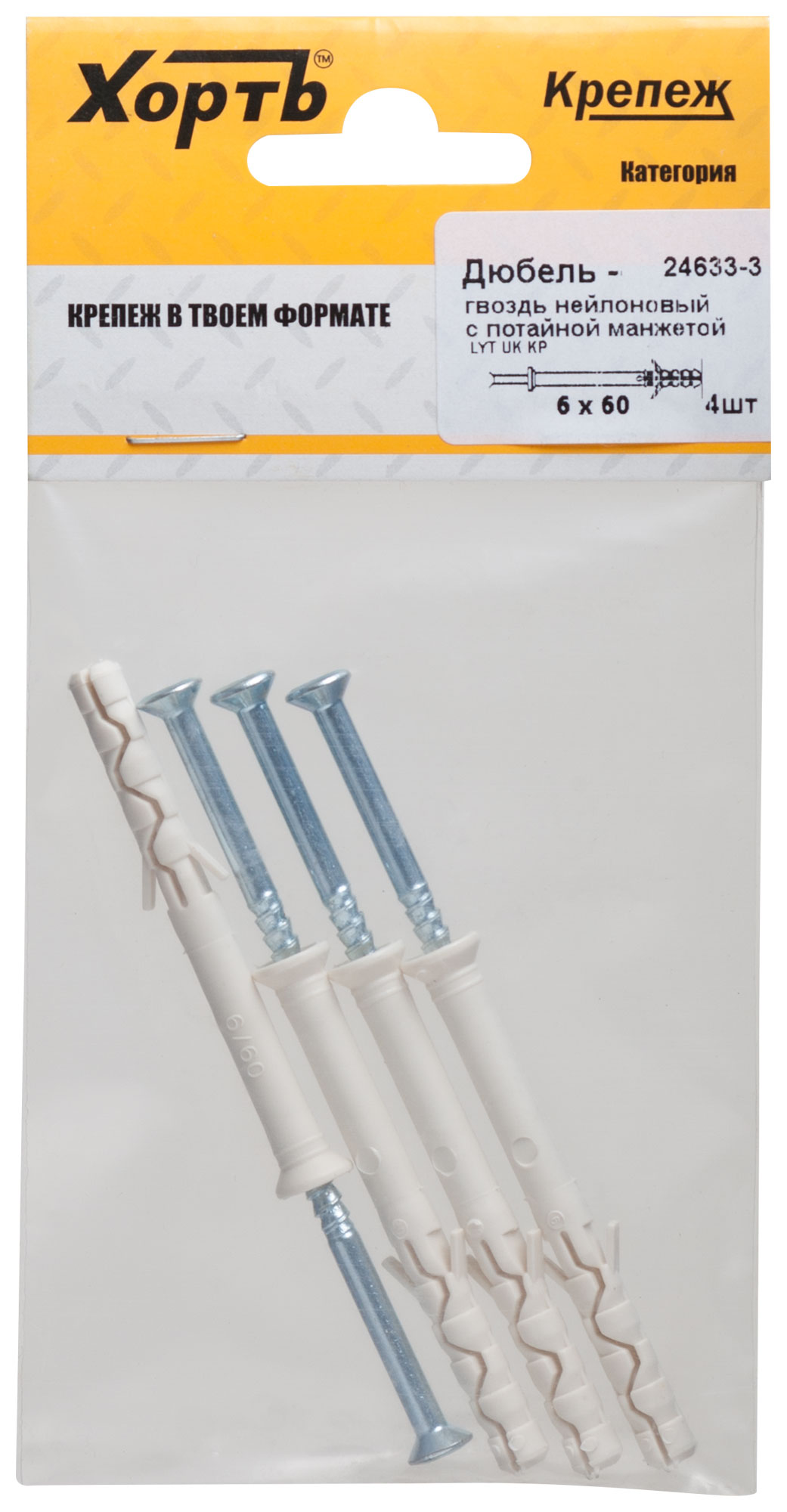 Дюбель-гвоздь нейлоновый с потайной манжетой LYT UK KP 6 х 60 (фасовка 4 шт.)