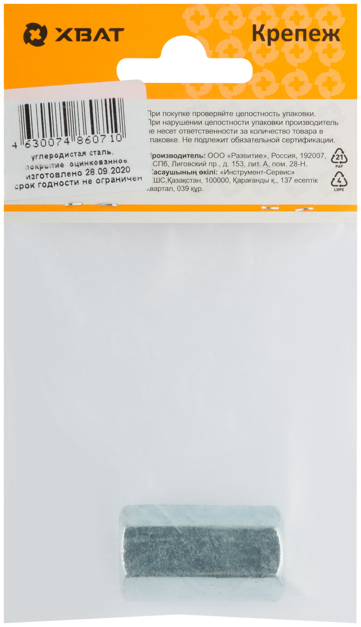 Изготовлена из конструкционной оцинкованной стали. Рекомендуется для соединения нестандартного метрического крепежа, например штанг между собой. Длина гайки равна примерно трем её диаметрам. Класс прочности не ниже 5.0