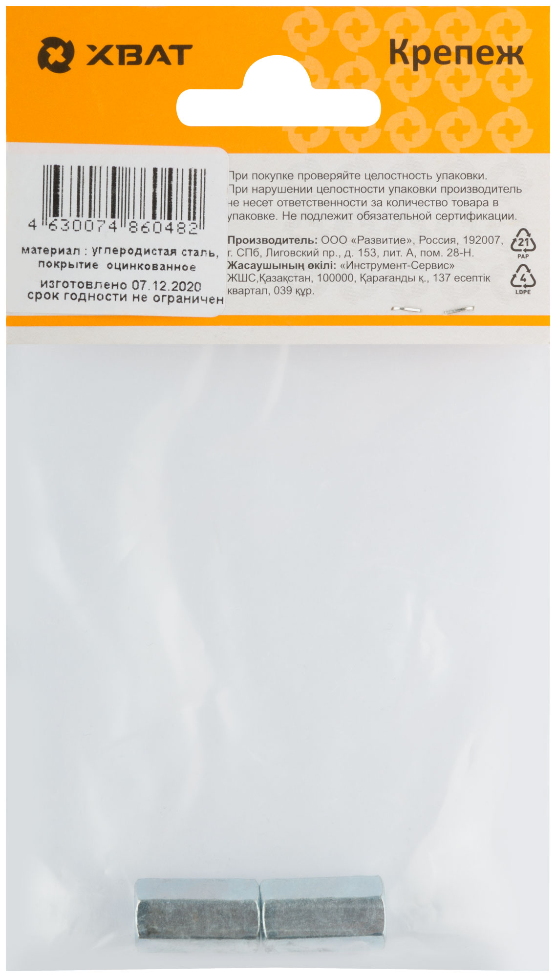 Изготовлена из конструкционной оцинкованной стали. Рекомендуется для соединения нестандартного метрического крепежа, например штанг между собой. Длина гайки равна примерно трем её диаметрам. Класс прочности не ниже 5.0