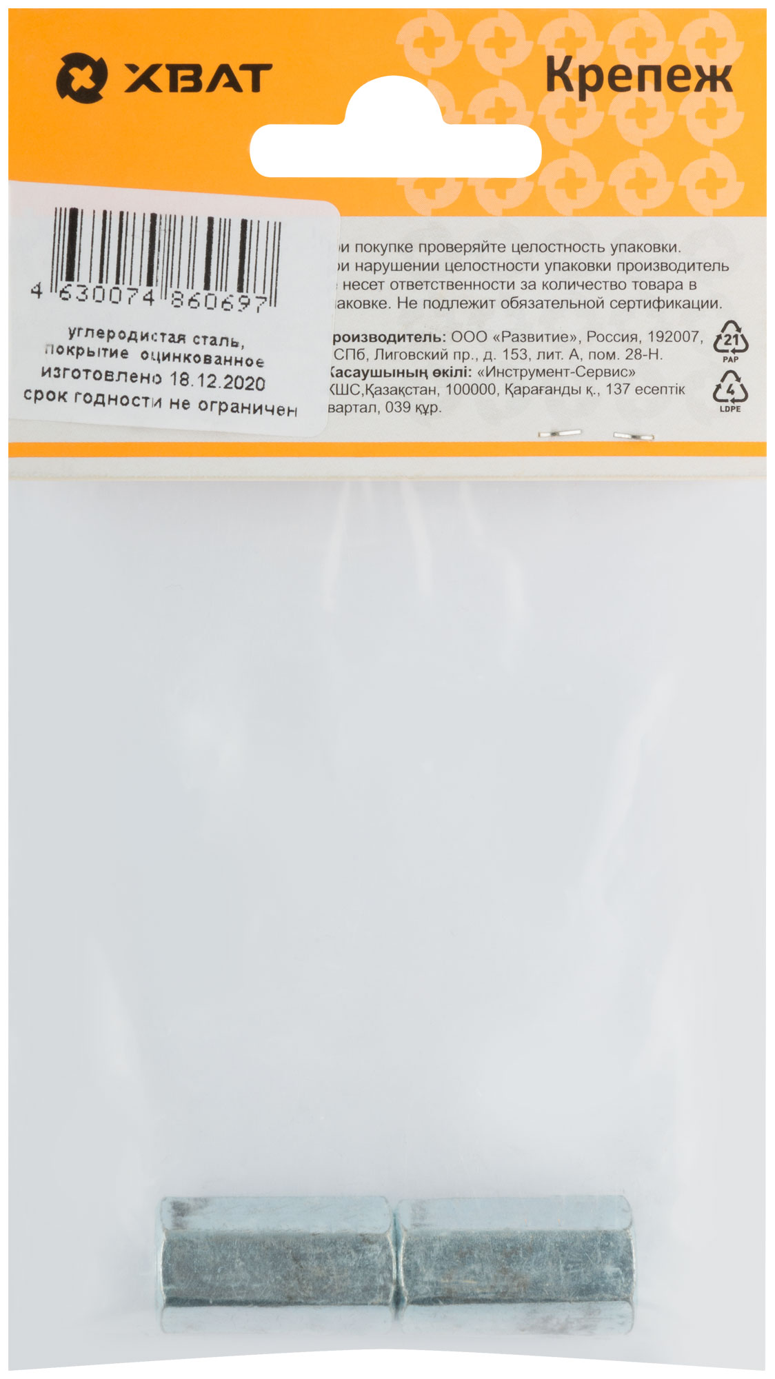 Изготовлена из конструкционной оцинкованной стали. Рекомендуется для соединения нестандартного метрического крепежа, например штанг между собой. Длина гайки равна примерно трем её диаметрам. Класс прочности не ниже 5.0