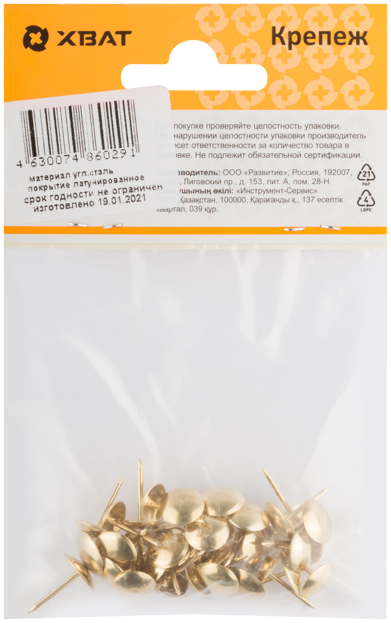Латунированные. Длина ножки 13 мм. Предназначены для крепления задних стенок из ДВП и МДФ в корпусной мебели. Имеют большую грибовидную декоративную шляпку, позволяющую использовать их при обивке мебели, дверей и т.д.