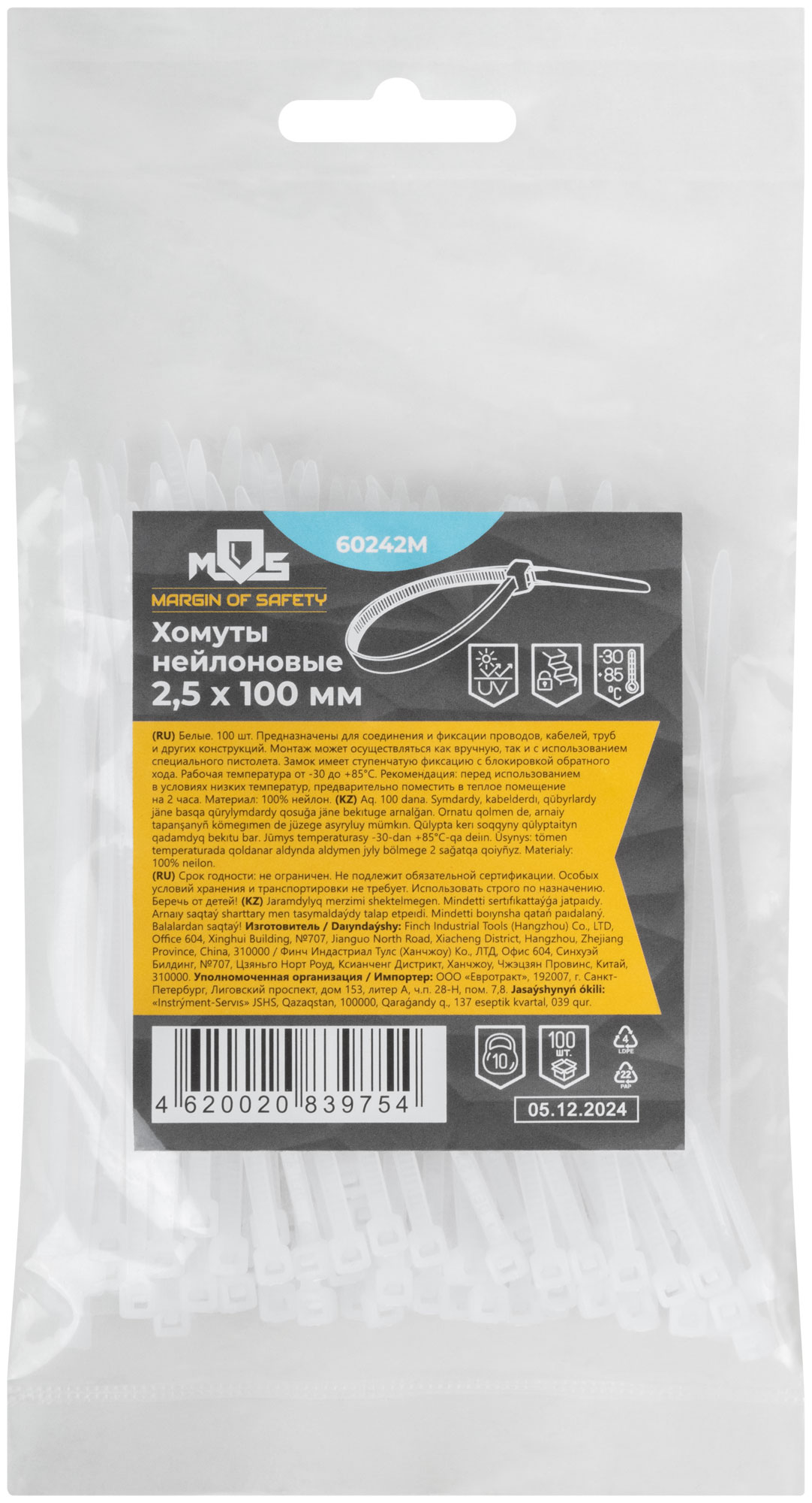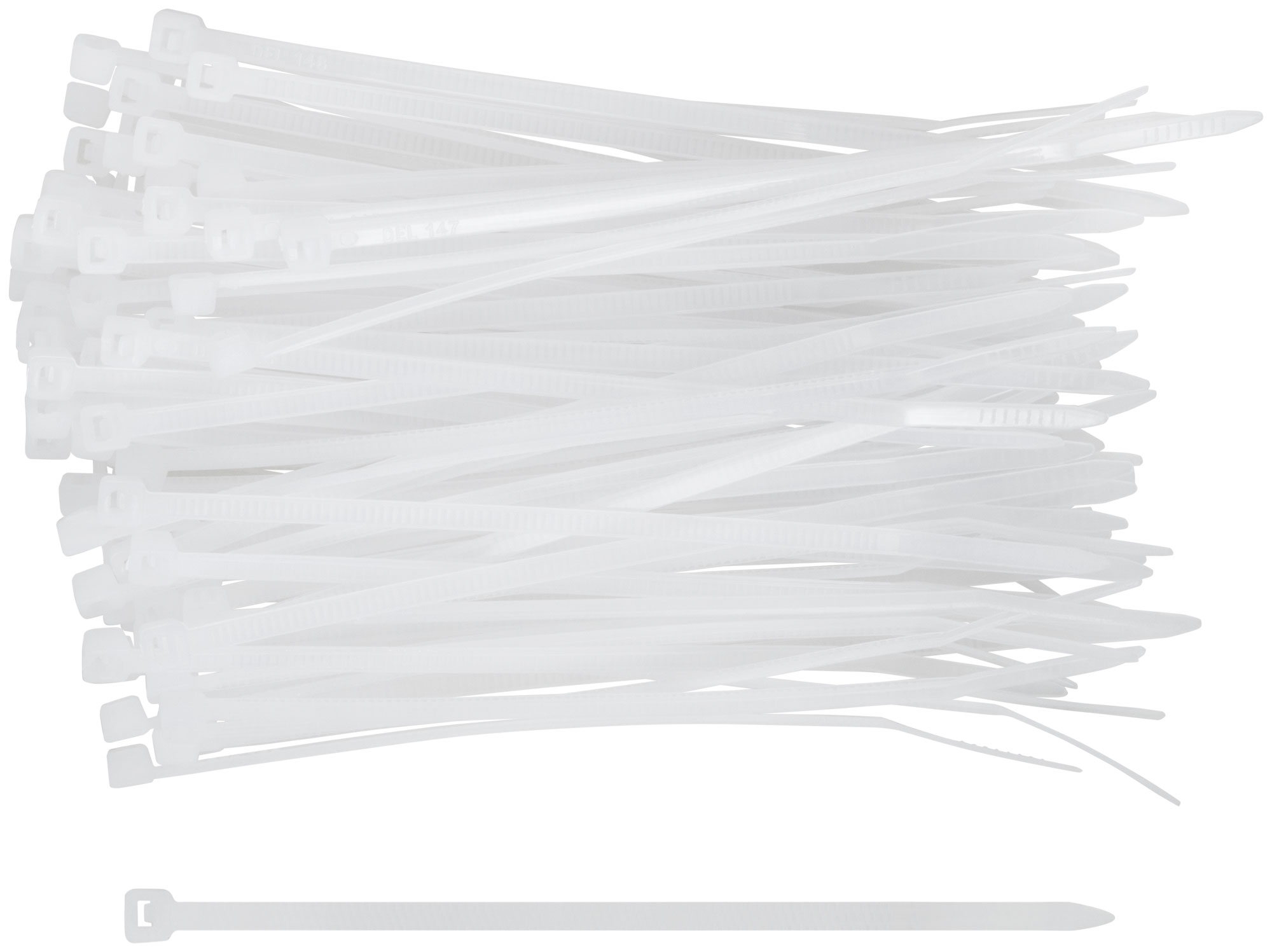 Белые. 100 шт. Предназначены для соединения и фиксации проводов, кабелей, труб и других конструкций. Монтаж может осуществляться как вручную, так и с использованием специального пистолета. Замок имеет ступенчатую фиксацию с блокировкой обратного хода. Материал: нейлон. Упаковка: п/э пакет с подвесом.