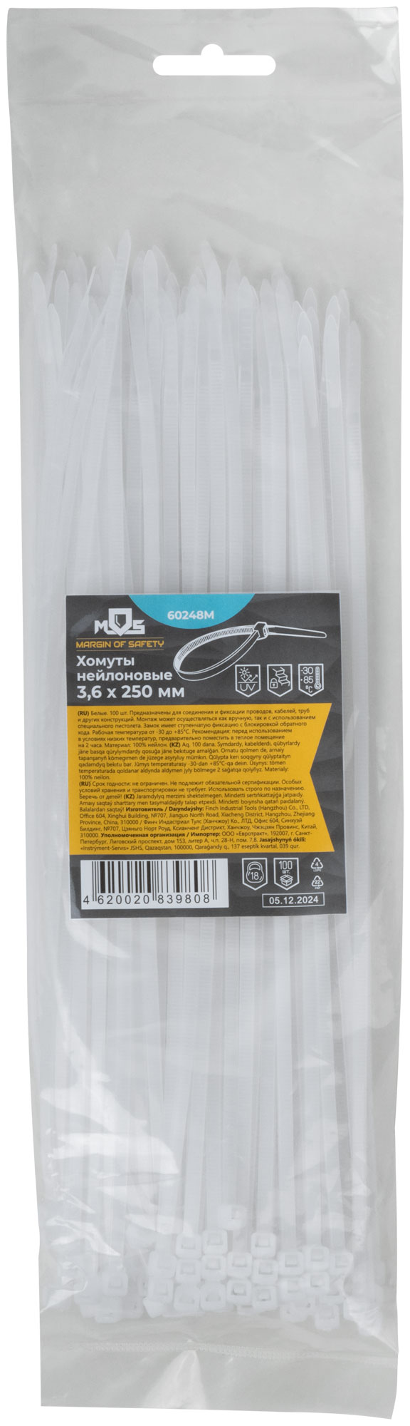 Хомуты нейлоновые для проводов, белые 100 шт., 3,6х250 мм