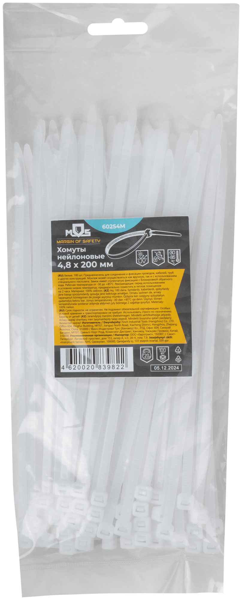 Хомуты нейлоновые для проводов, белые 100 шт., 4,8х200 мм