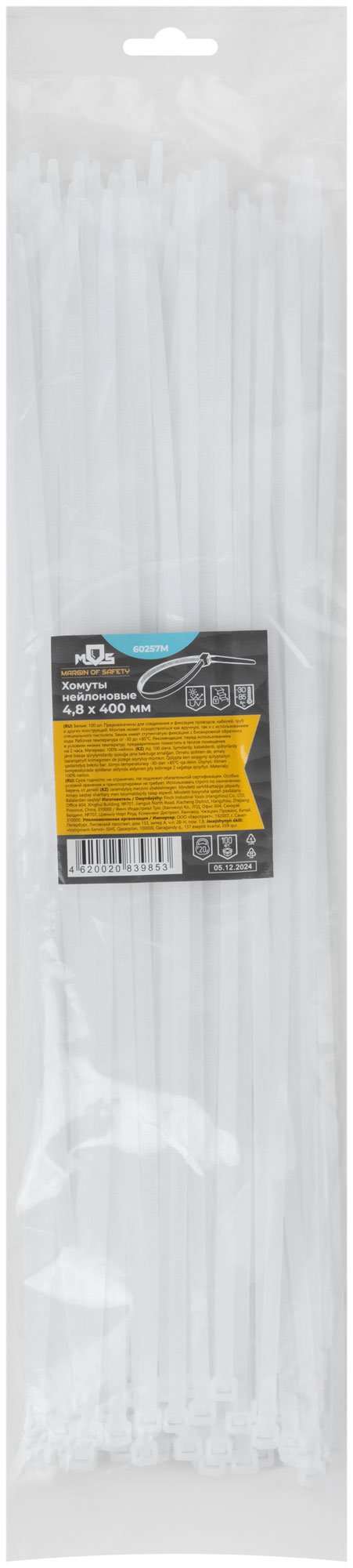 Хомуты нейлоновые для проводов, белые 100 шт., 4,8х400 мм