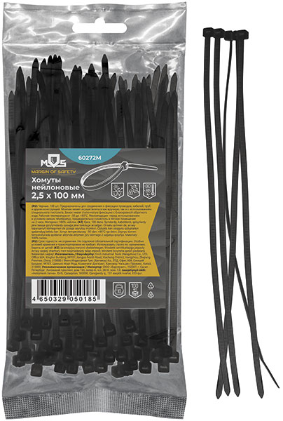 Черные. 100 шт. Предназначены для соединения и фиксации проводов, кабелей, труб и других конструкций. Монтаж может осуществляться каквручную, так и с использованием специального пистолета. Замок имеет ступенчатую фиксацию с блокировкой обратного хода. Материал: нейлон. Упаковка: п/э пакет с подвесом.