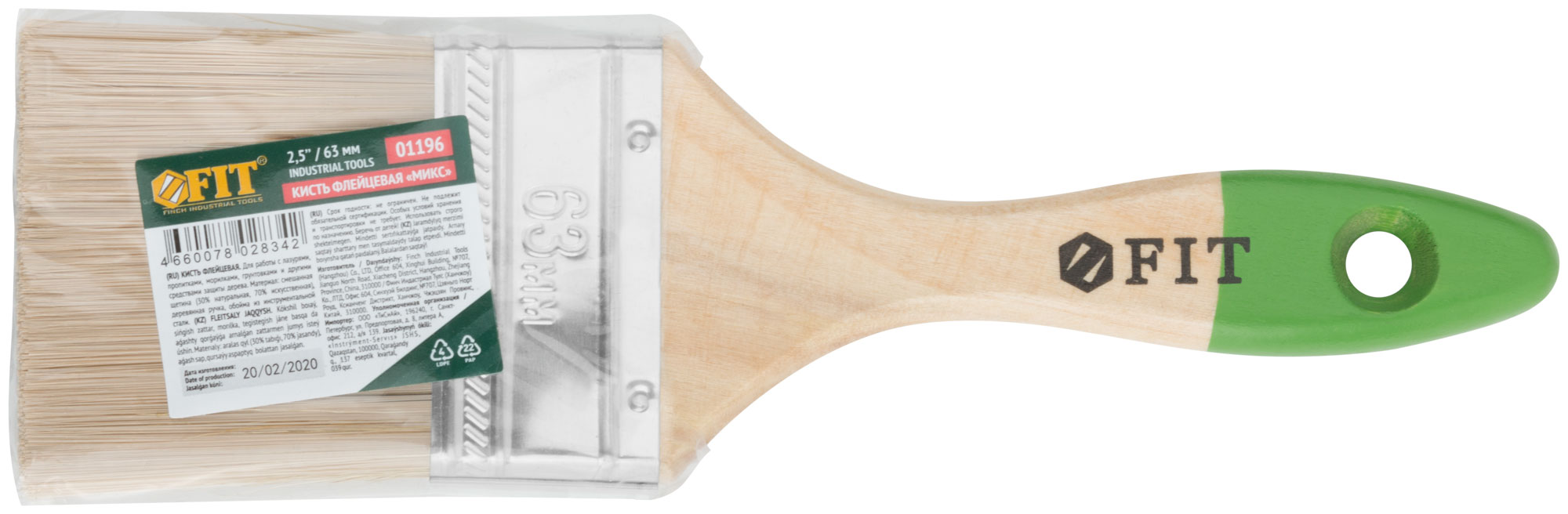 Кисть флейцевая "Микс", смешанная натуральная и искусственная щетина, деревянная ручка 2,5" (63 мм)